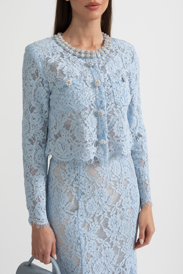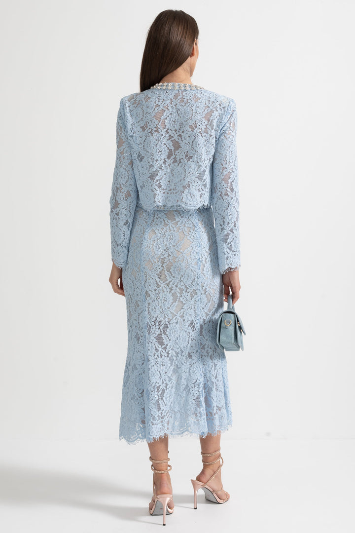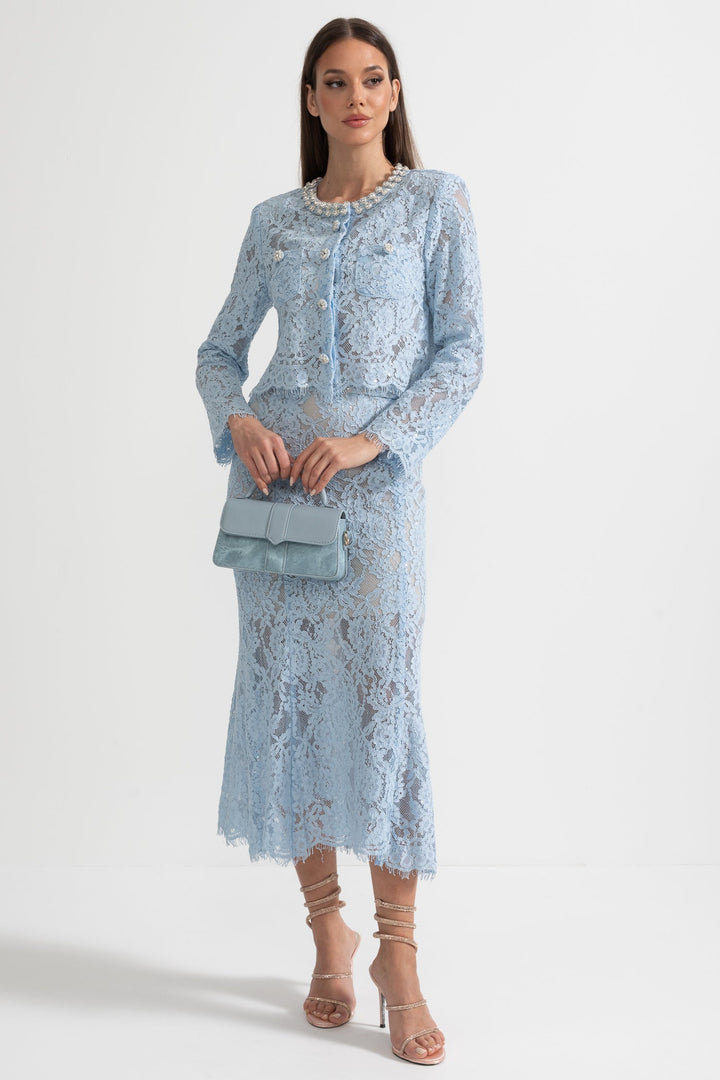 Mavi Dantel Ko-Ord, Parıldayan Yaka Süslemeleri ve Midi Etek ile