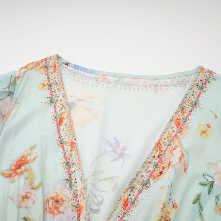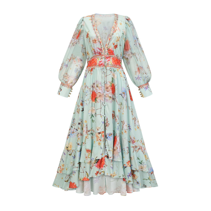 Jailina Çiçekli V Yaka Uzun Kollu Maxi Elbise