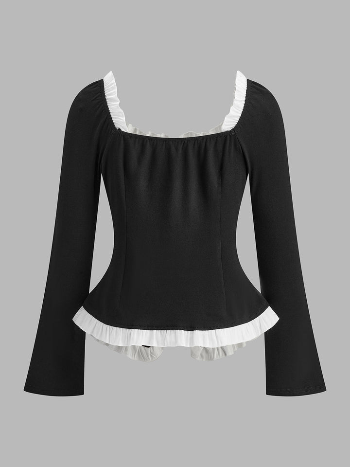 Kare Yaka Kontrast Marul Kesimli Yırtmaçlı Bluz