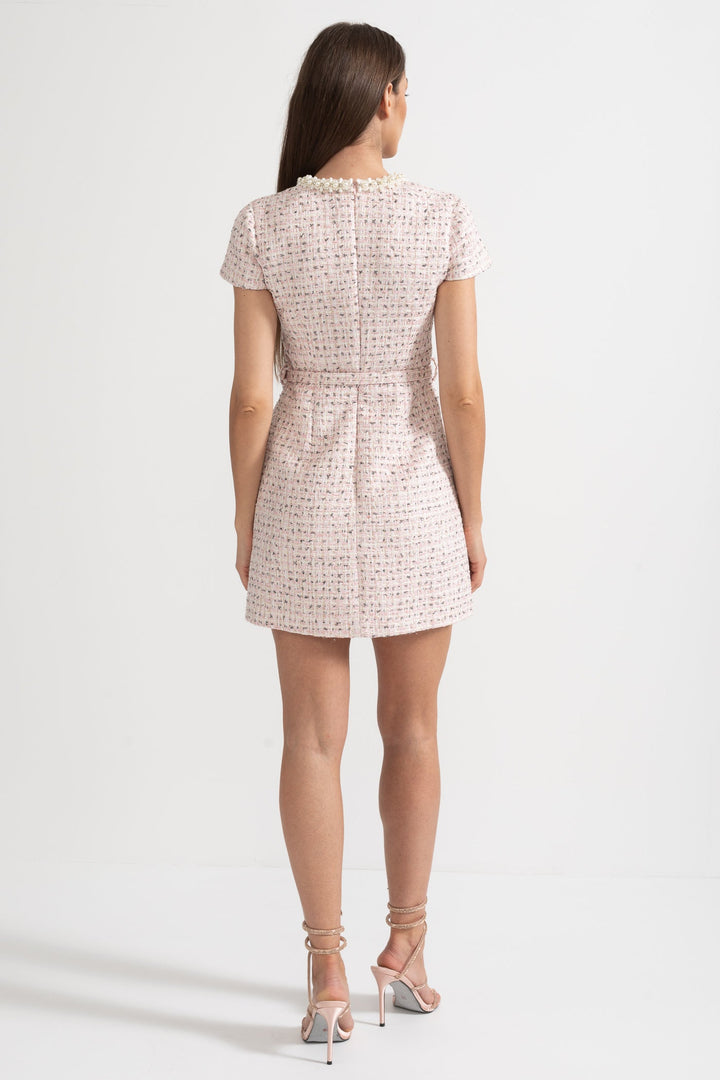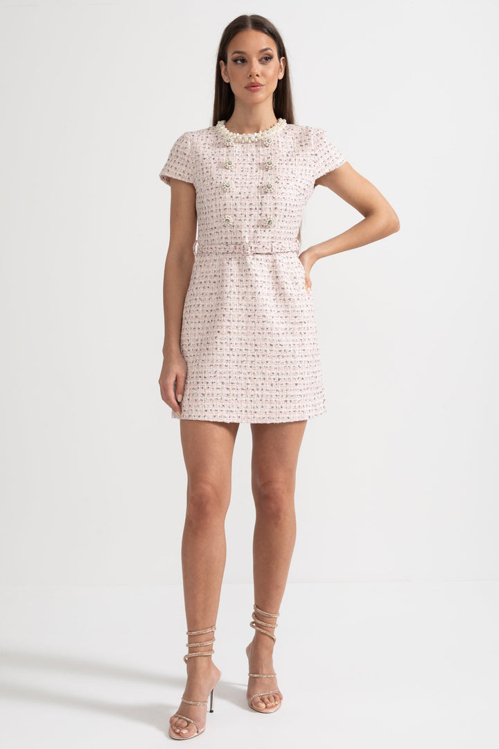 Pembe Şık Dokulu Mini Elbise, Kısa Kollu ve Uyumlu Kemer ile