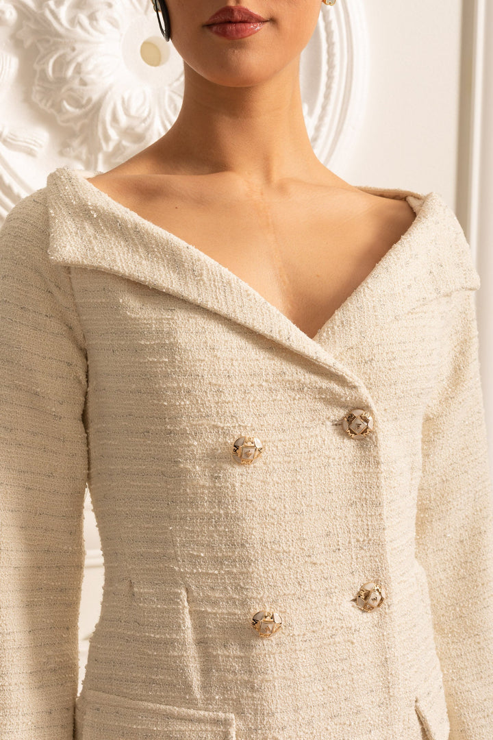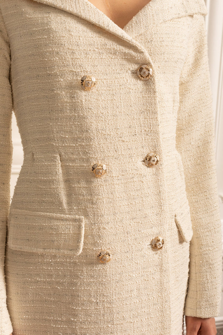 Ürün Başlığı: Bej Dokulu Çift Düğmeli Elbise - Dekoratif Altın Düğmeli