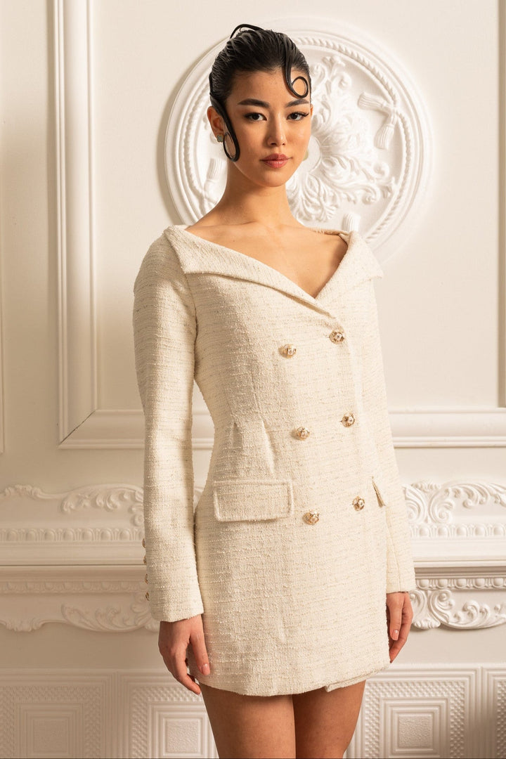 Zarif bir stil arayanlar için ideal olan bu bej dokulu elbise, çift düğmeli tasarımı ve göz alıcı altın düğme detaylarıyla şıklığı en üst seviyeye taşıyor. Uzun kollu tasarımı, işlevsel çift ceplerle tamamlanarak hem modern hem de sofistike bir görünüm sunar. Hem iş toplantılarında hem de özel davetlerde kendinizi zarif hissetmek için mükemmel bir tercih!