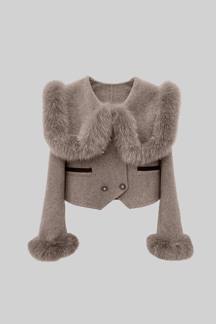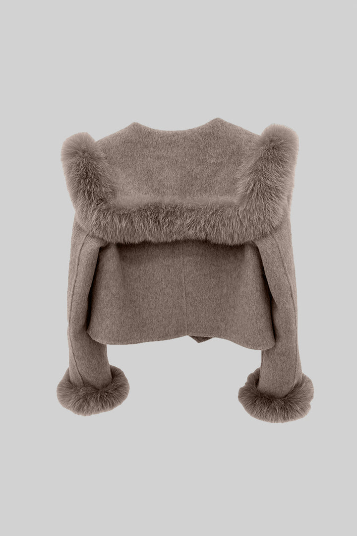 Şıklığı ve sofistike detaylarıyla öne çıkan bu kısa kahverengi ceket, gardırobunuza modern bir dokunuş katıyor. Çift düğmeli tasarımı, kürk yaka süslemesi ve kürk detaylı manşetleriyle hem zarif hem de trend bir görünüm sunar. Siyah kontrast dikişler ve sahte cep detaylarıyla tasarımına özgünlük katarak her kombini tamamlar.