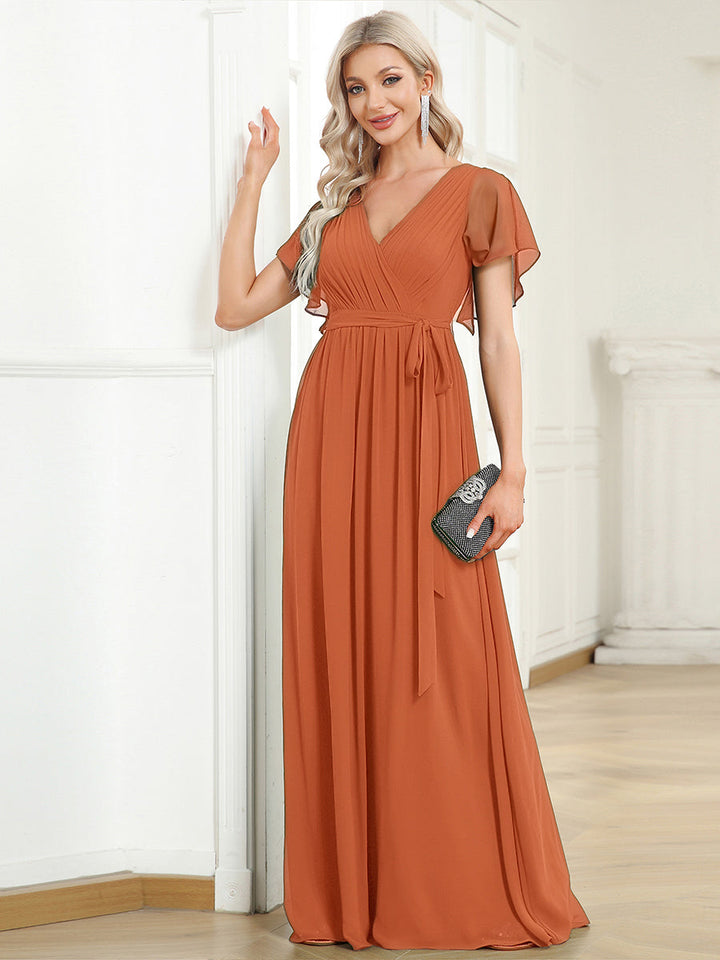 Klasik kesim tasarımıyla öne çıkan bu elbise, pileli şifon katmanları, V yaka detayı, hafif volanlı kısa kolları ve akıcı silüetiyle sofistike bir görünüm sunar. Siyah ya da metalik topuklularla kombinleyerek stilinizi tamamlayabilirsiniz.
