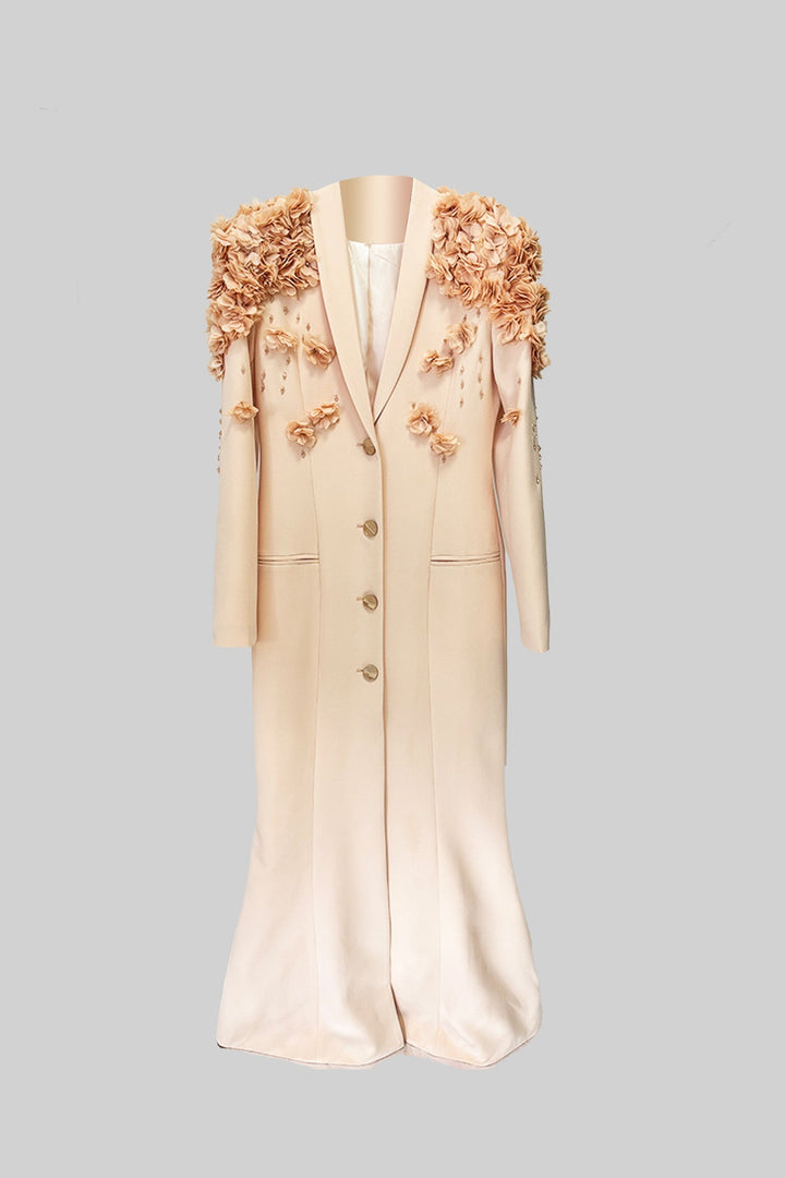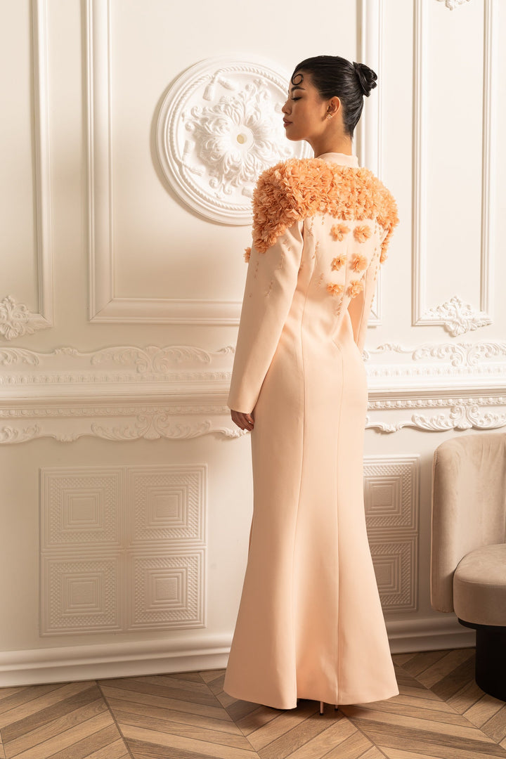 3D Kontrast Çiçekli Omuz ve Sırt Aksesuarlı Uzun Palto - Şeftali