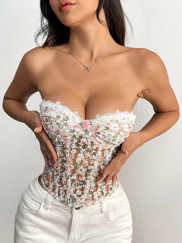 Zarif çiçek desenleri ve karmaşık dantel kenarlarının büyüleyici buluşması olan Bustier, vücut hatlarınızı ön plana çıkaran şık bir tasarıma sahiptir. Balenli yapısıyla mükemmel destek sunarken, dantel kenarlı kalp yaka romantik ve vintage bir hava katıyor. Bu bustier, hem özel günler hem de günlük şıklık arayanlar için ideal bir seçimdir.
