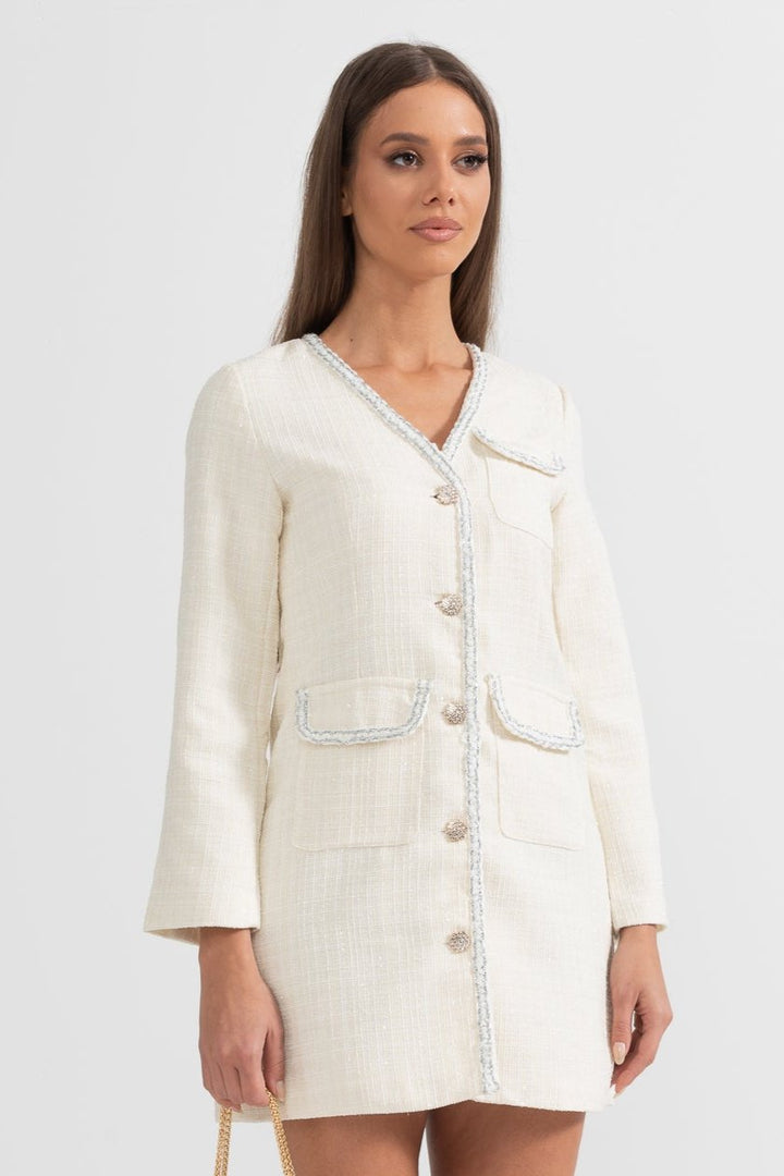 Zarif ve sofistike tasarımıyla Beyaz Modern Gümüş Dikiş Detaylı Elbise, lüks detayları ve modern çizgileriyle dikkat çekiyor. Hafif kumaşı sayesinde konfor sunarken, gümüş örgü dikiş detayları ve dekoratif cep süslemeleri elbiseye sofistike bir hava katıyor.