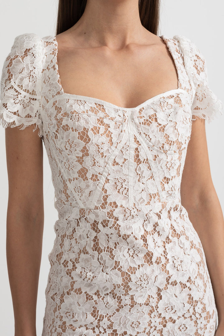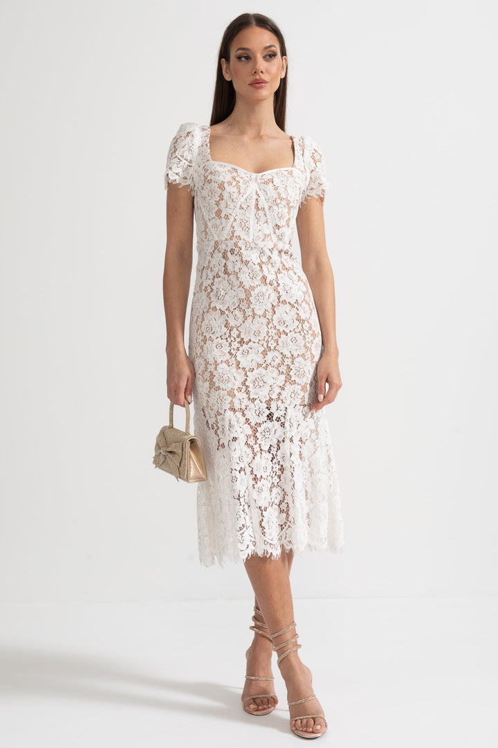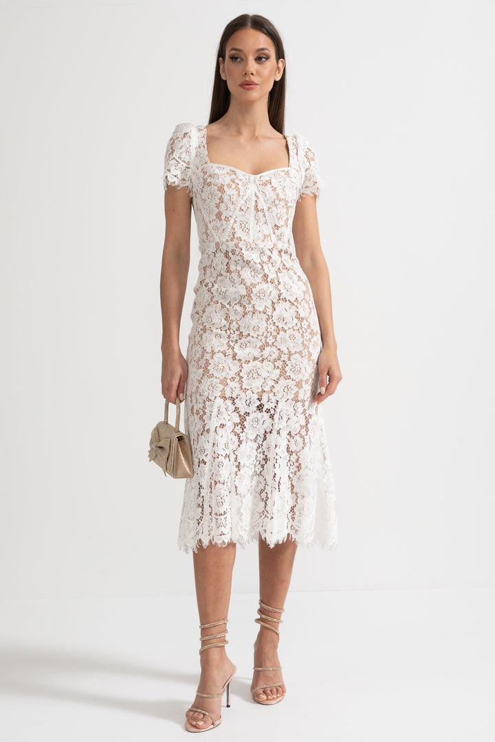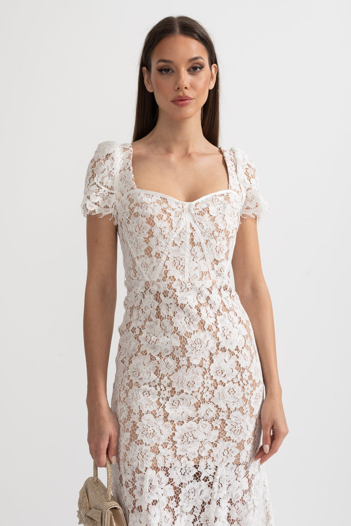 Beyaz Kısa Kollu Dantel Elbise, Uyumlu Bel Kemeri ile
