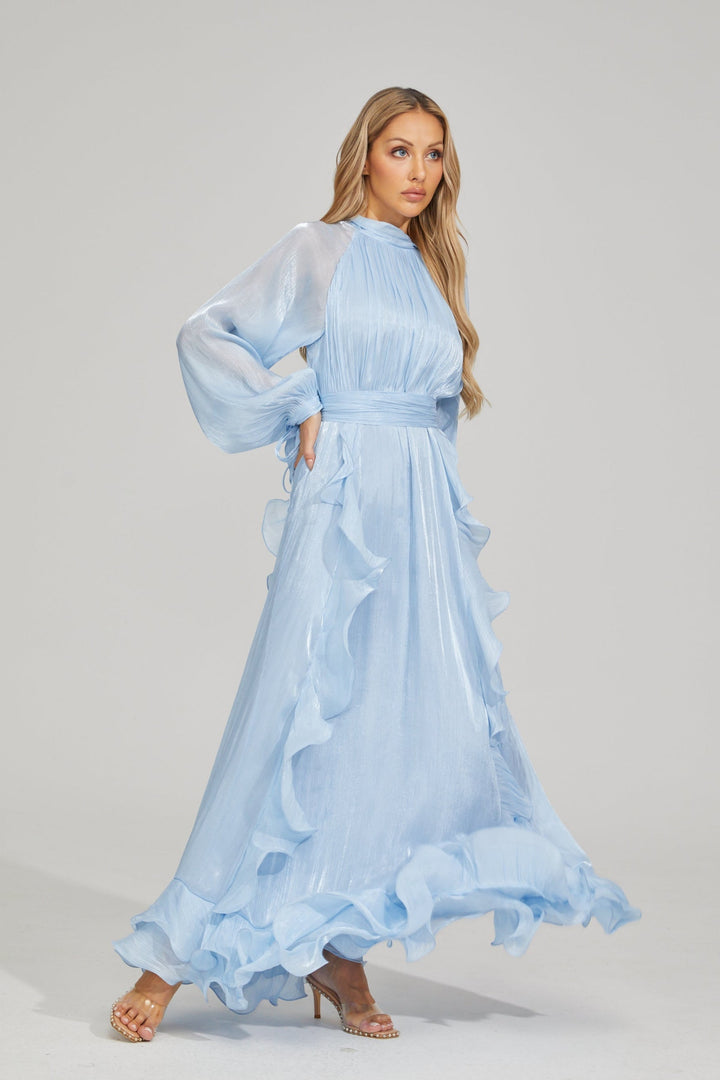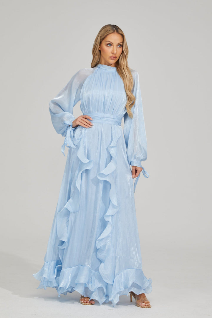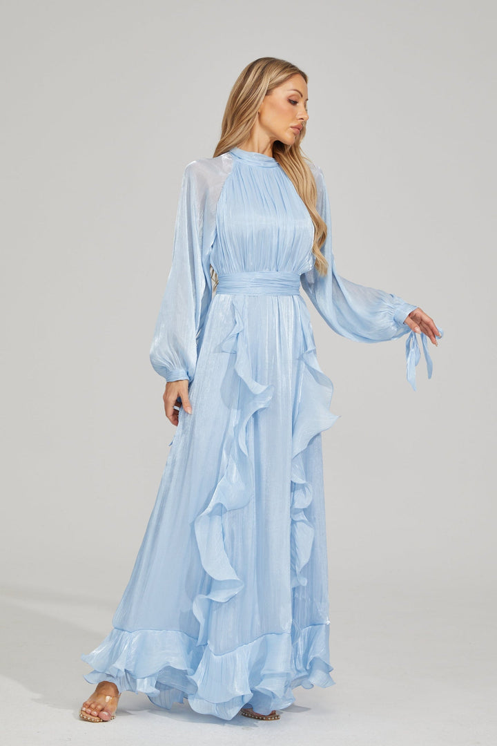 Zarafeti oyunbaz bir dokunuşla seven kadınlar için tasarlanan Blue Noir Fırfırlı Maxi Elbise, etek ve kollarındaki akıcı fırfır detaylarıyla hafif ve zarif bir etki yaratır. Hafif pileli korsajı ve kloş etek kesimi, elbiseye zamansız bir şıklık kazandırırken, belden oturan formu vücut hatlarını zarifçe ön plana çıkarır. Kol manşetlerindeki ince kurdele bağcıkları, feminenliğe ekstra bir çekicilik katarken; ister resmi bir davette, ister bahçe partisinde ya da özel bir gecede, sizi zahmetsiz zarafetle öne çıkarır.