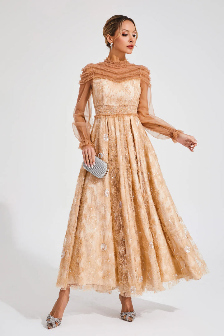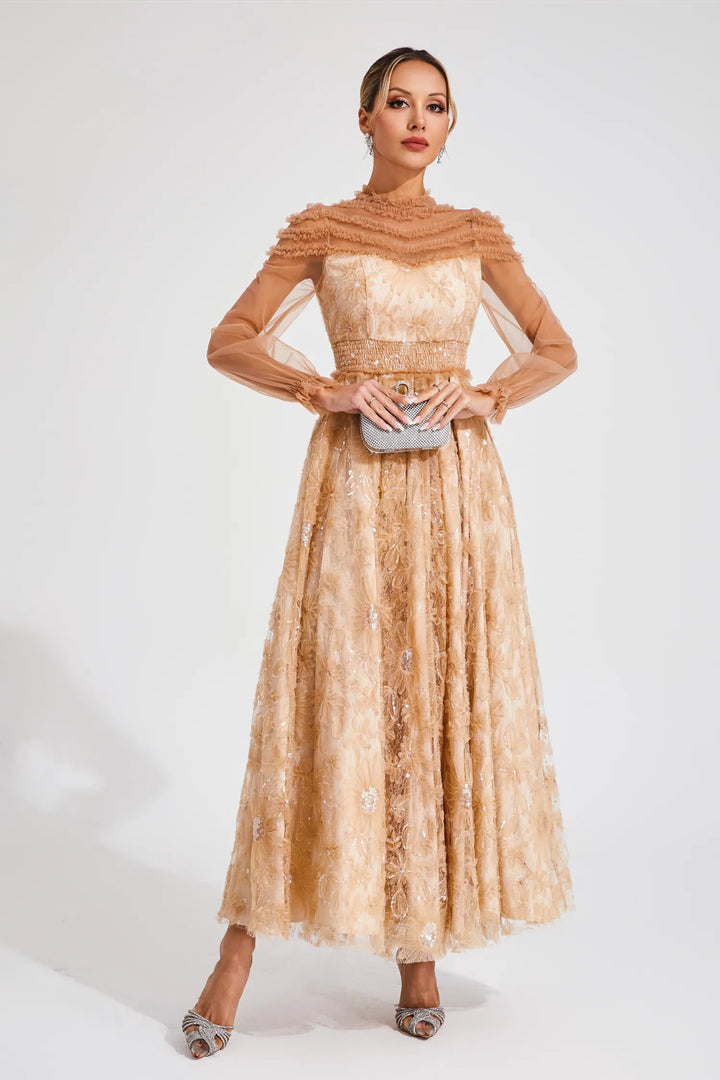 Dantel ve Payetli Maxi Elbise, Fransız zarafetinin bir başyapıtıdır. İnce işlenmiş dantel ve ışıltılı payetlerle tasarlanan bu elbise, tatlı ve romantik bir hava yansıtır. Çiçek desenleri, uzun kolları ve yüksek bel detayıyla siluetinizi zahmetsizce uzun gösterir. Akşam davetleri için mükemmel bir seçim olan bu elbise, katıldığınız her parti veya özel etkinlikte sizi öne çıkarır.