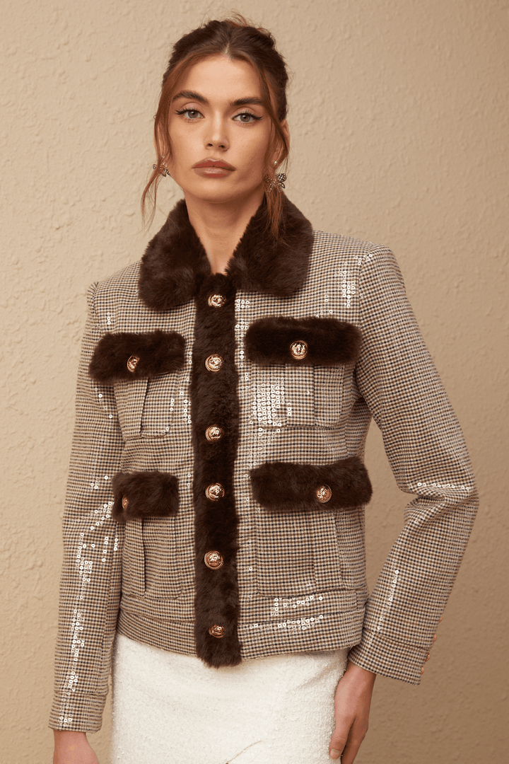 Nova Kahverengi Kareli Kürk Detaylı Ceket