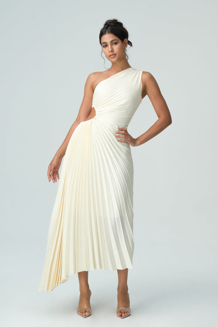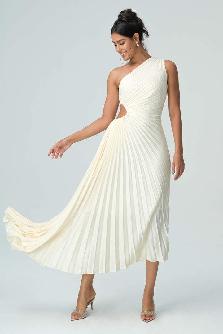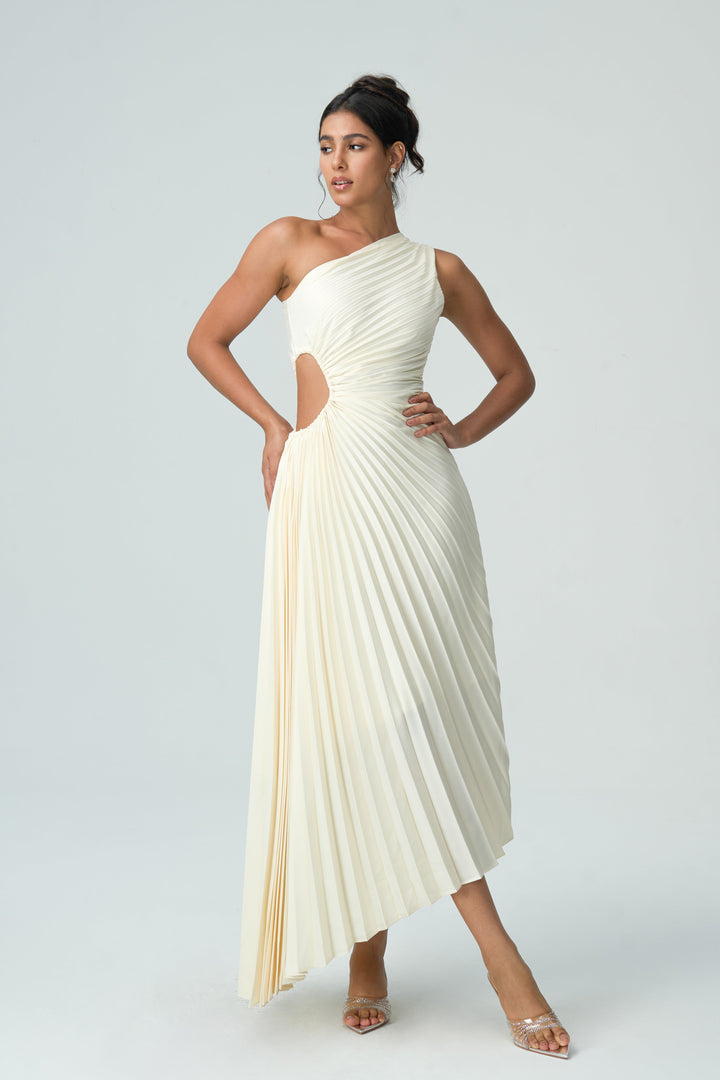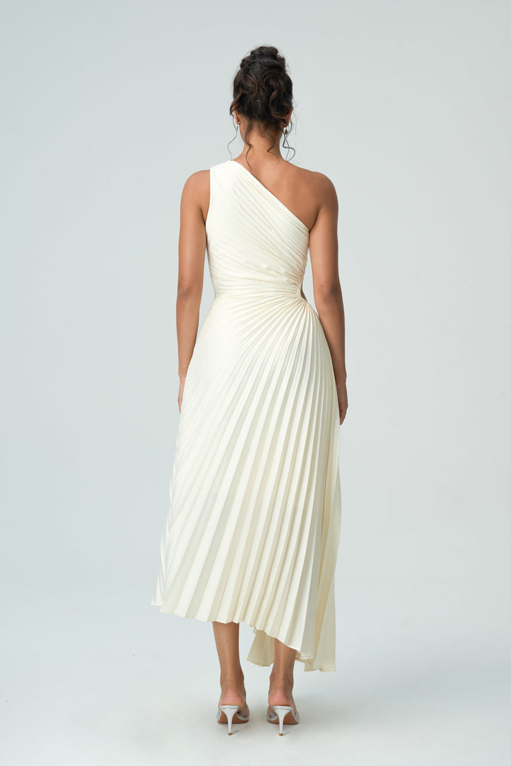 Tek Omuzlu Pileli Midi Elbise – Modern ve Zarif