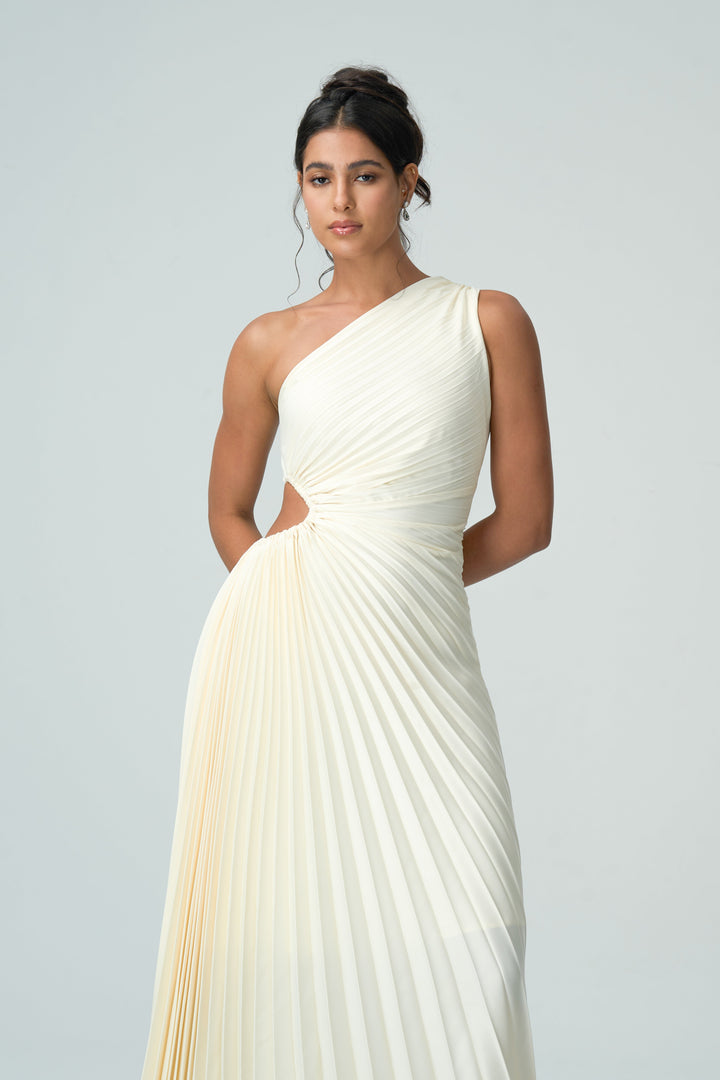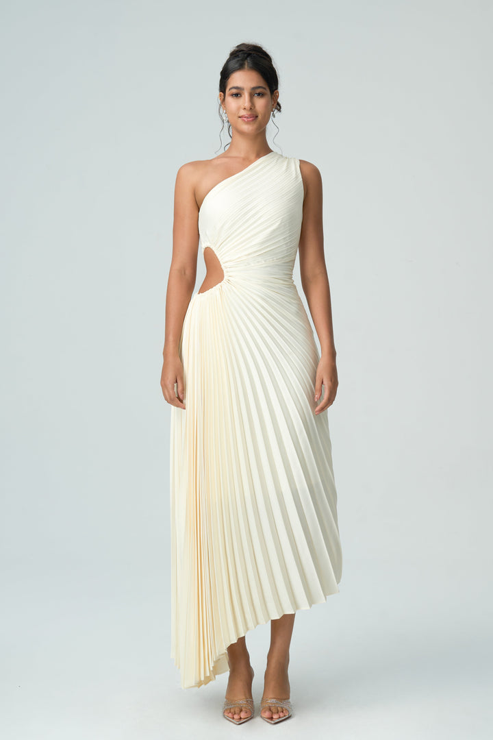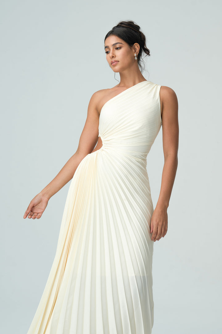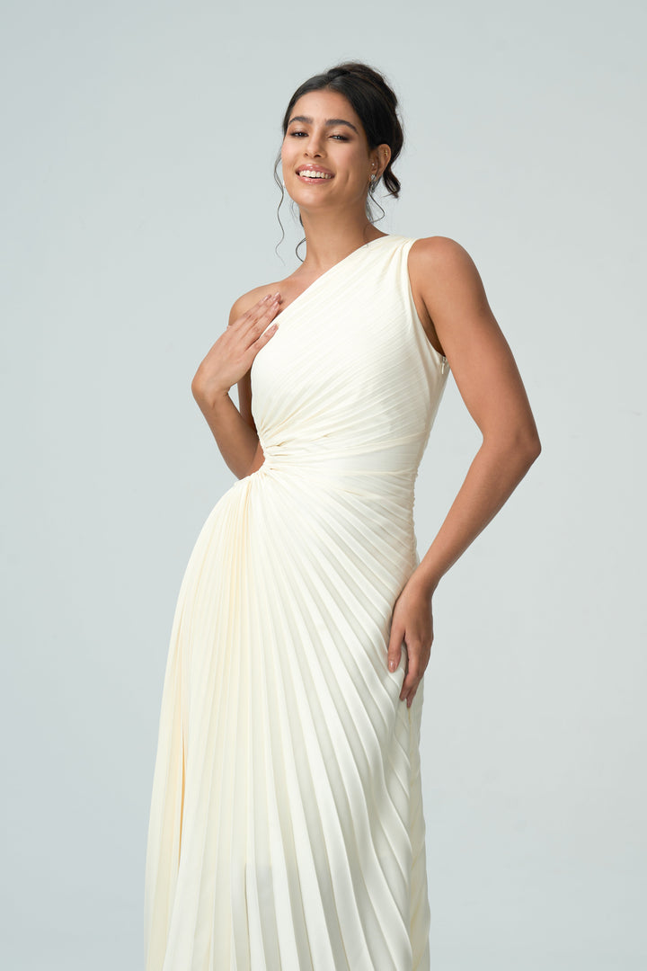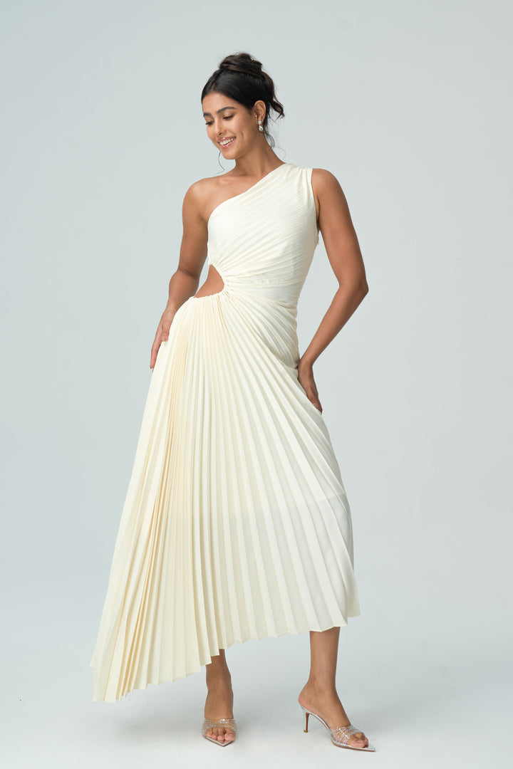 Tek Omuzlu Pileli Midi Elbise – Modern ve Zarif
