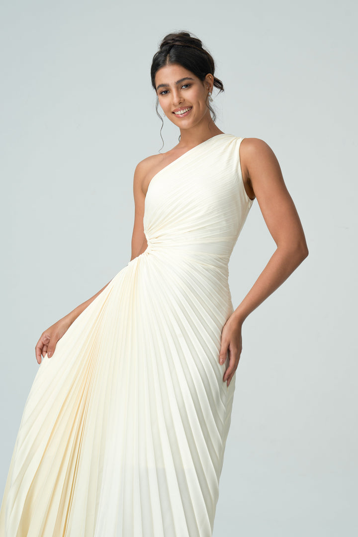 Bu şık midi elbise, asimetik tek omuz kesimi, zarif pileli kumaşı ve şık yan dekolte detayıyla hem modern hem de sofistike bir görünüm sunuyor. Hafif ve akıcı yapısı, gün boyu konfor sağlarken, zamansız krem rengi her türlü aksesuarla kolayca kombinlenebilir.