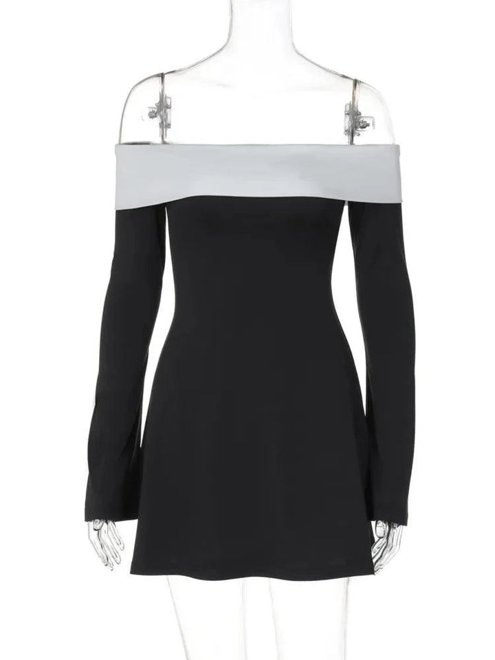 Bu zarif omuzları açık mini elbise, kontrast beyaz yakalı şık siyah bir tasarıma sahiptir. Resmi etkinlikler veya akşam gezmeleri için mükemmel olan kloş silueti, her adımda rahatlık ve stil sağlar.