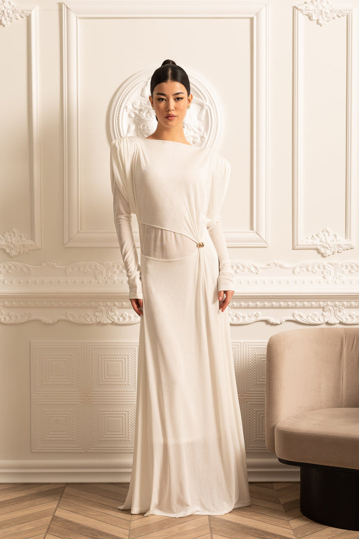 Bu zarif beyaz uzun kollu elbise, yüksek yaka stili ve dekoratif katmanlı bel bükümüyle asil bir görünüm sunar. Yapılı omuz detayları, güçlü ve sofistike bir silüet yaratırken, akıcı maxi etek tasarımı her adımda zarafeti vurgular. Hem resmi davetlerde hem de özel etkinliklerde şıklığınızla fark yaratmak için mükemmel bir tercih!