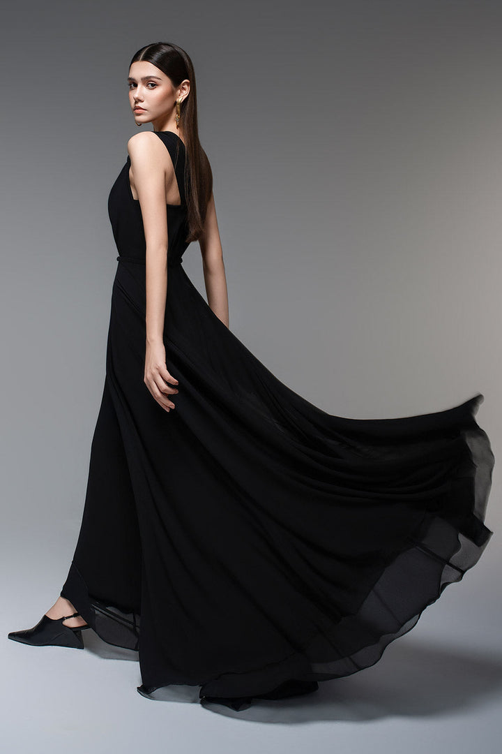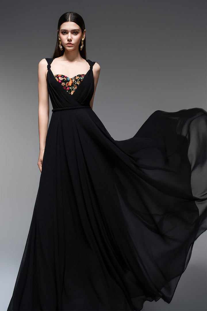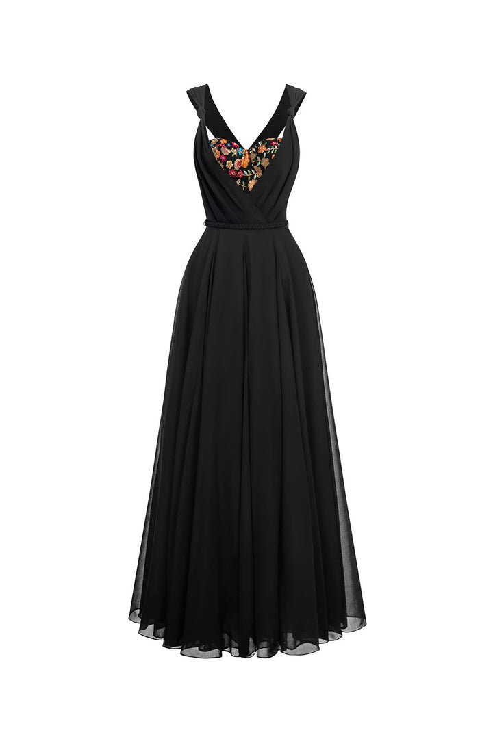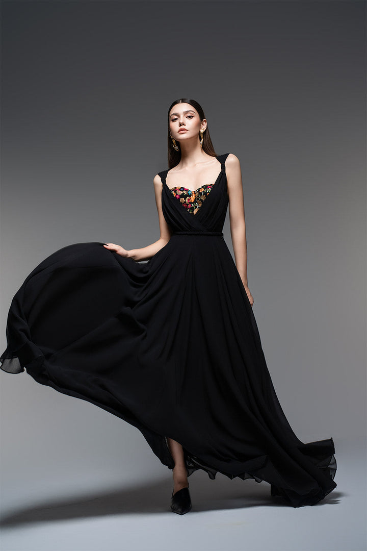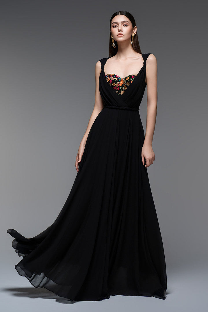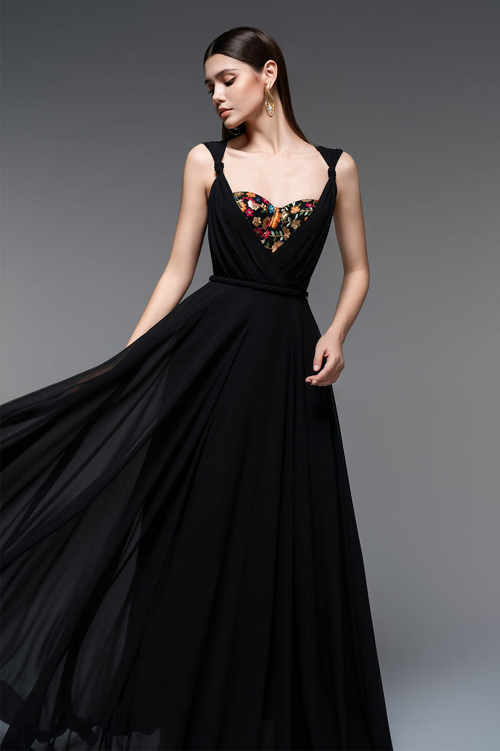 Bu elbise yarı kalp yakalı ve şifon kumaşıyla zarif bir şekilde yere kadar uzanıyor. Özel günler için mükemmel olan A kesim silueti tüm vücut tiplerini düzleştirirken şifon malzeme rahat ve nefes alabilen bir uyum sağlar.