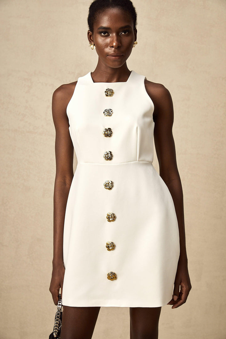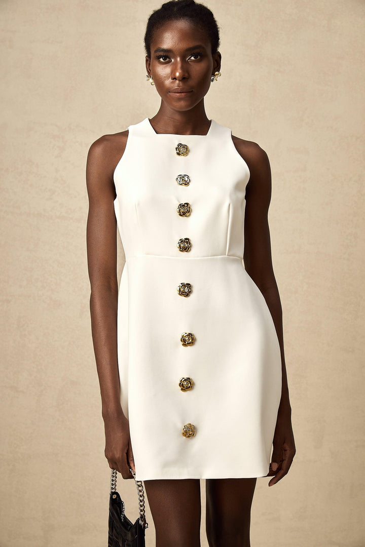 Opulent Bloom Altın Düğme Detaylı Kolsuz Mini Elbise