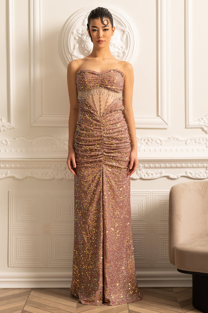 Işıltılı Payet Dokulu ve Büzgü Detaylı Gösterişli Gece Elbisesi – Bej
