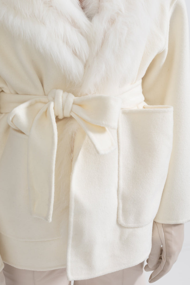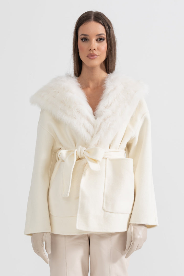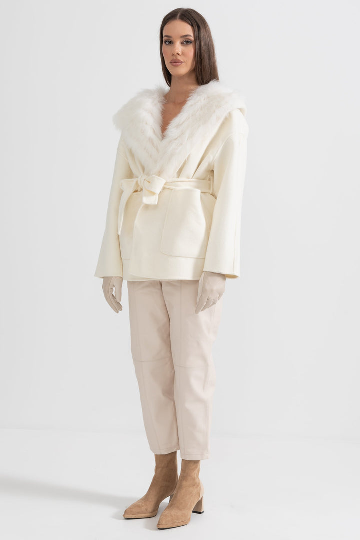 Zarif ve şık bir stil sunan bu krem ceket, oversize kapüşonu ve bel detaylı tasarımıyla öne çıkar. Tam boy kolları ve kaliteli yün kumaşı ile hem konforlu hem de sofistike bir görünüm sağlar. Elegant drape kesimi, her kombine zarafet katar.