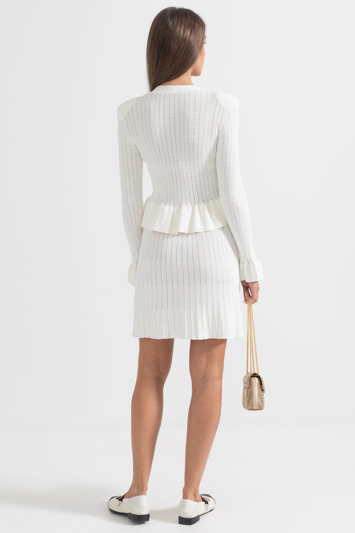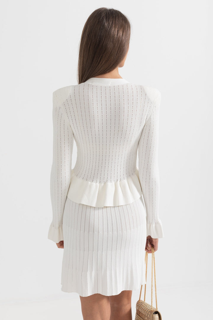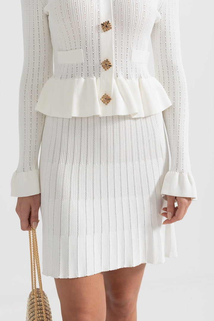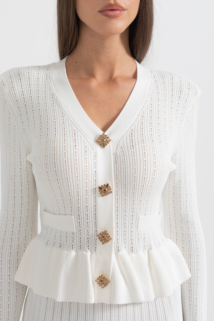 Beyaz Uzun Kollu Örme Elbise – Altın Düğme ve Peplum Bel Detaylı