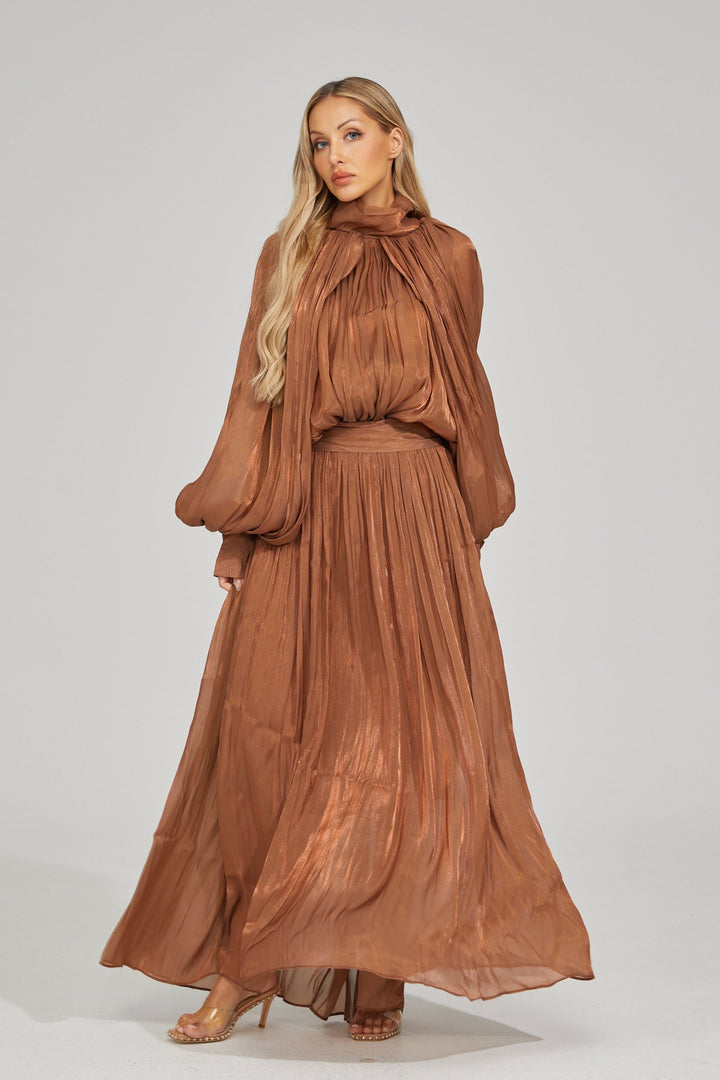 Bu kahverengi pileli maxi elbise, lüks saten dokusuyla sofistike bir görünüm sunar. Yüksek yaka tasarımı ve zarif pile detayları, rahat ve akışkan bir siluet oluşturur. Uzun kolları lastikli manşetlerle tamamlanmış olup, yere kadar uzanan etek hareket ettikçe zarifçe süzülür. Özel davetler, akşam etkinlikleri veya şık buluşmalar için ideal bir seçimdir.