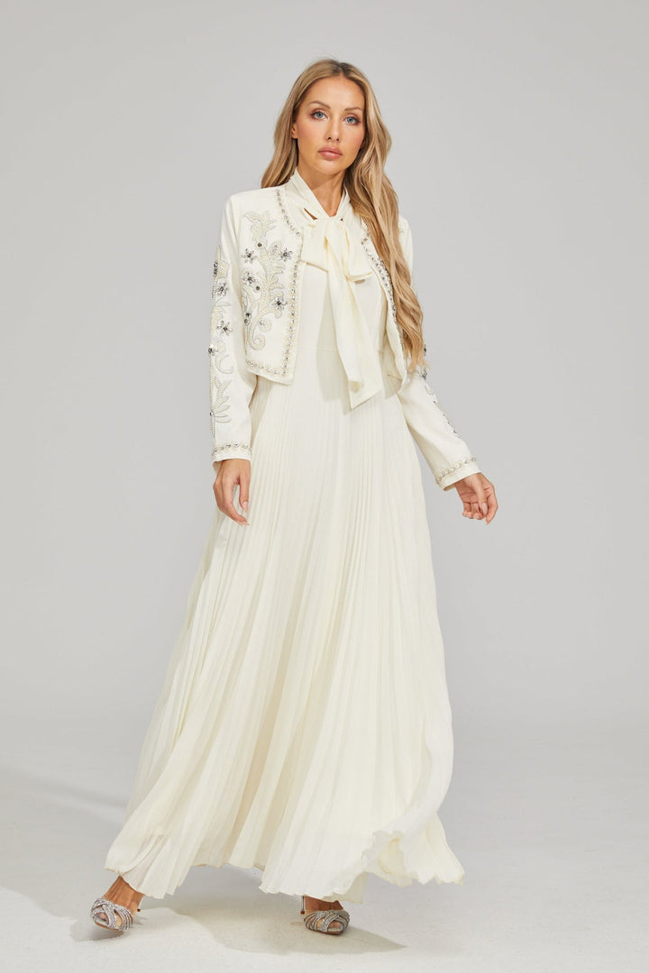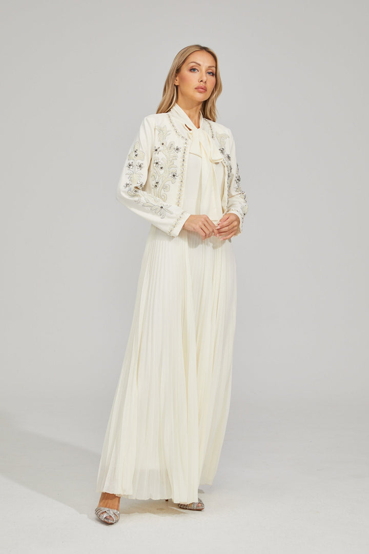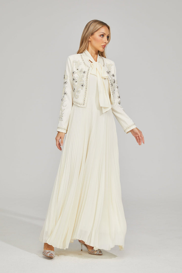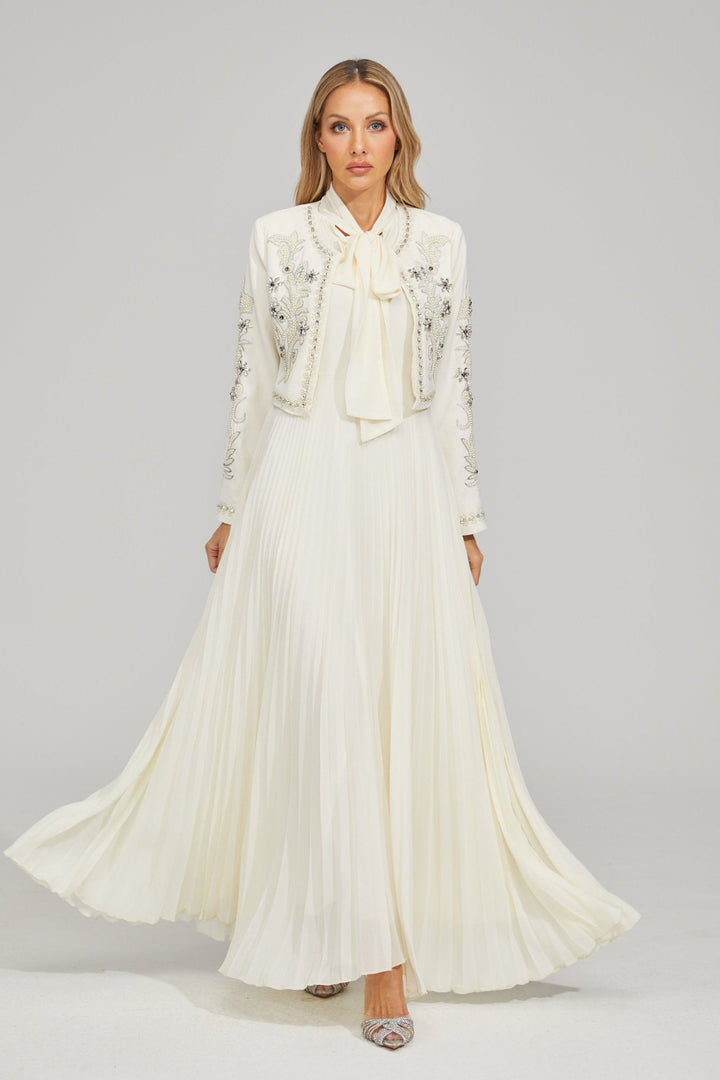 Zarafet ve sofistike stili bir araya getiren bu şık takım, akıcı fildişi renkli pileli maxi elbise ile gümüş çiçek işlemeli ve kristal detaylarla süslenmiş kısa ceketten oluşur. Yumuşak boyun bağı, tasarıma vintage bir feminen dokunuş katarken, hafif kumaş adımlarınızla birlikte zarifçe akarak şık bir siluet oluşturur. Özel davetler, akşam etkinlikleri veya görkemli kutlamalar için ideal bir tercih olan bu takım, zamansız şıklığı ve sofistike cazibeyi bir arada sunar.