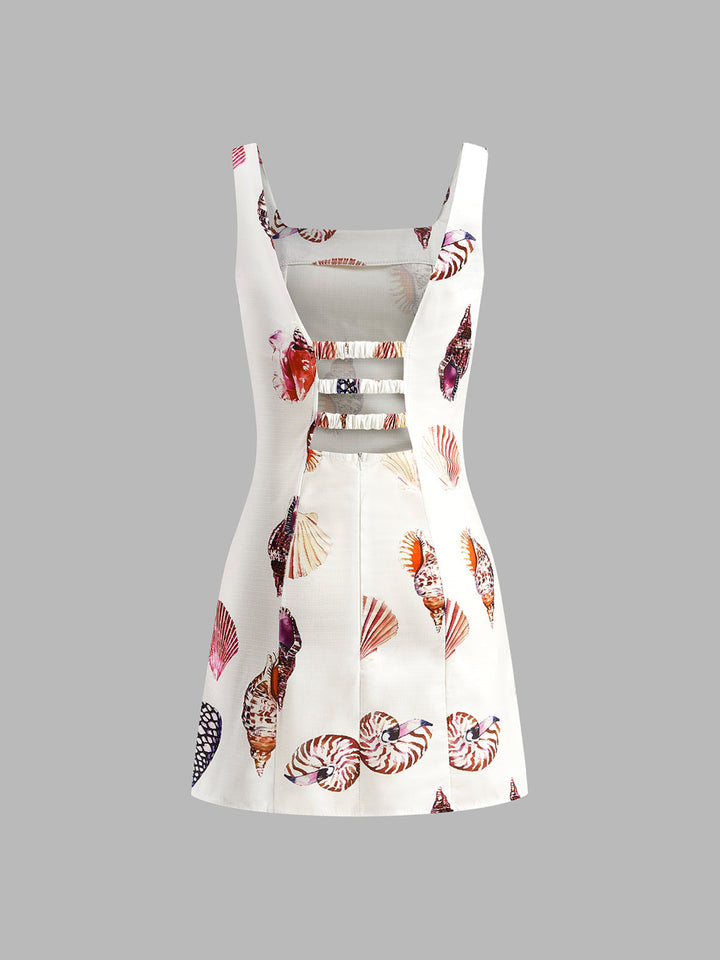 Baskılı Kesik Kare Yaka Kısa Elbise