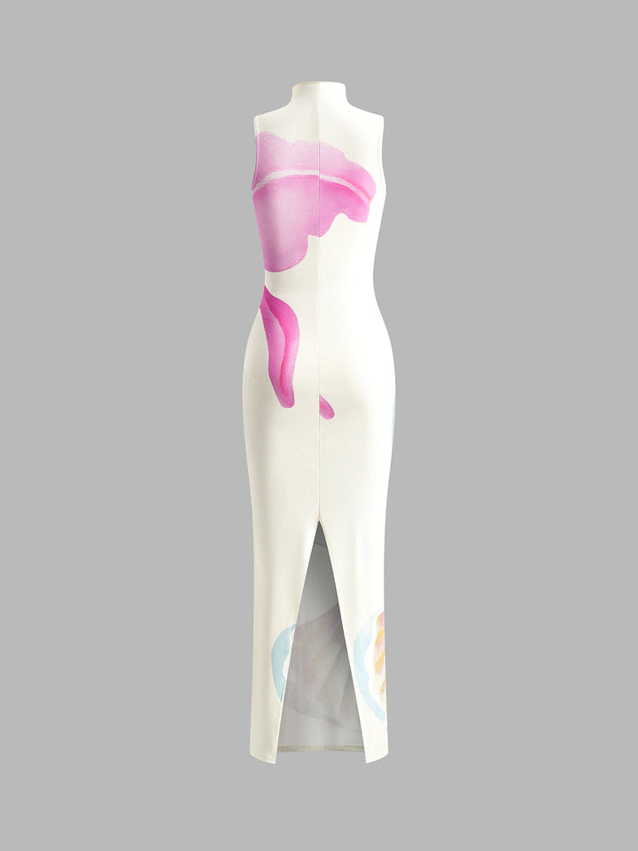 Baskılı Mock Yaka Yırtmaçlı Elbise