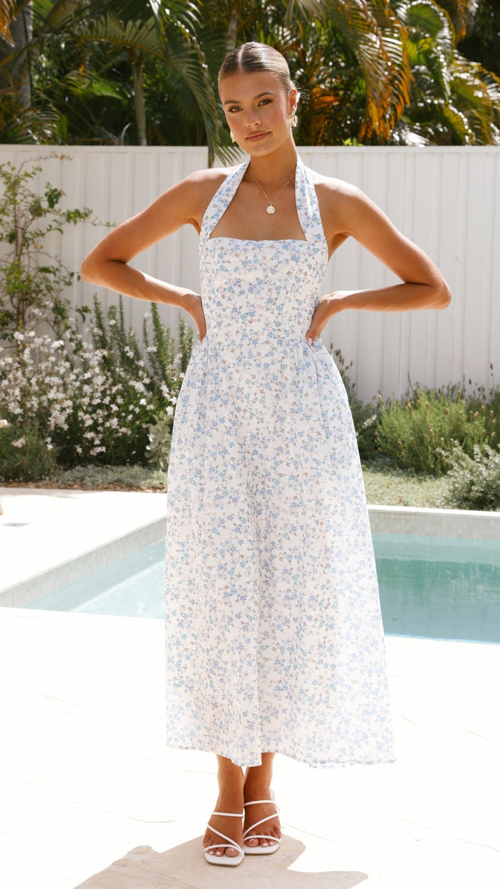 Salas Halter Maxi Elbise - Beyaz / Mavi Çiçek Desenli