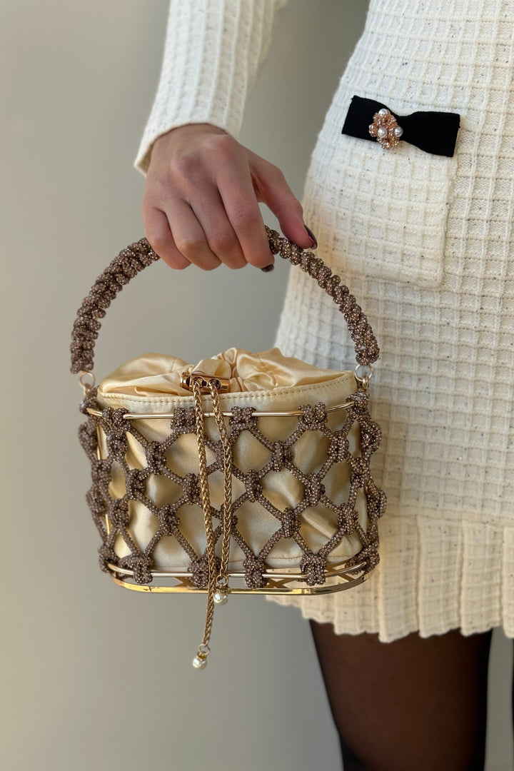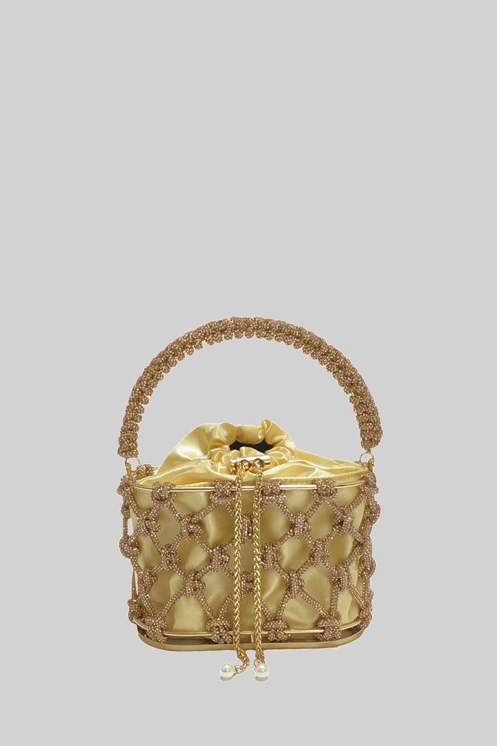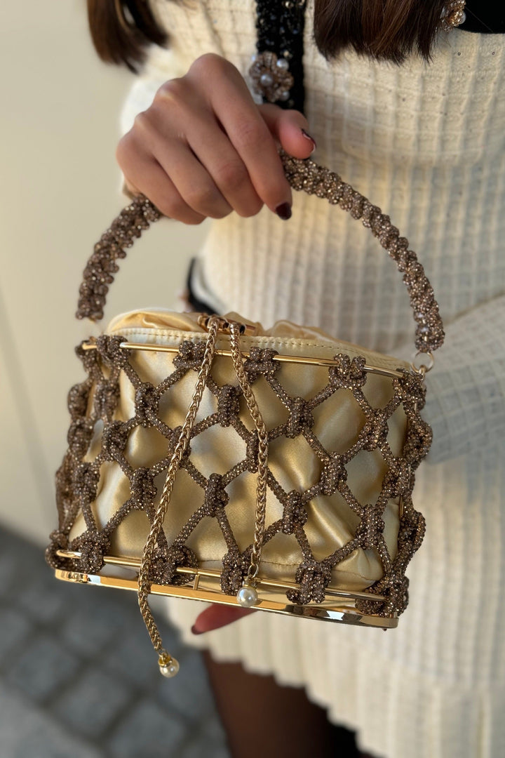 Altın Işıltılı File El Çantası – Saten Büzgülü Keseli