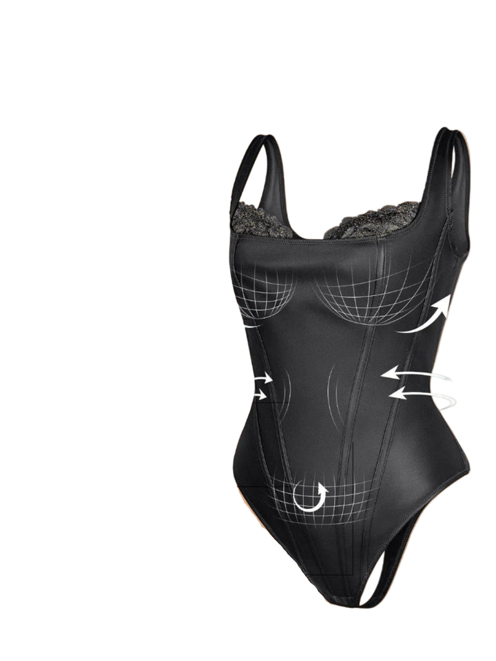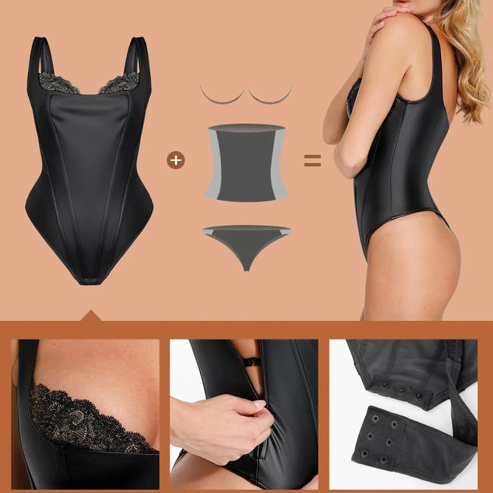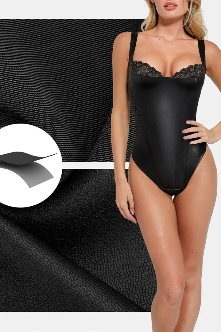 Aysham Suni Deri & Dantel Body | Balconette Yaka & Gizli Fermuarlı Tasarım