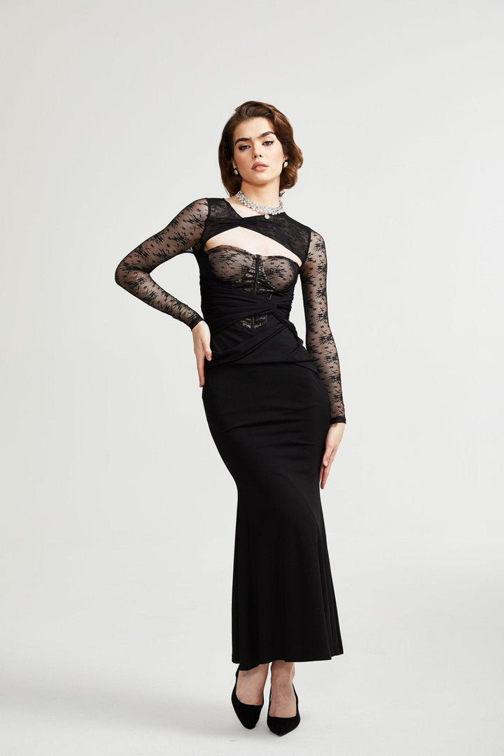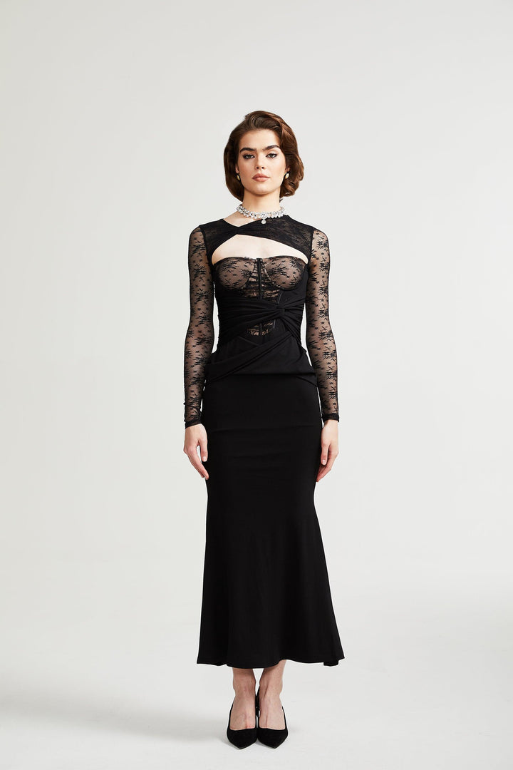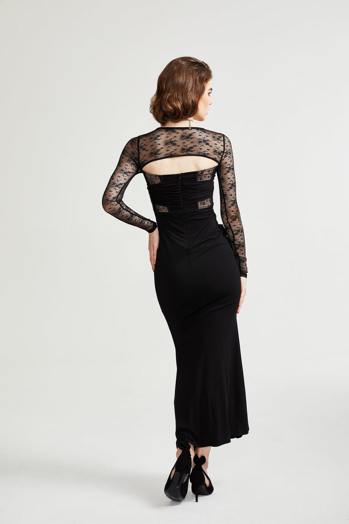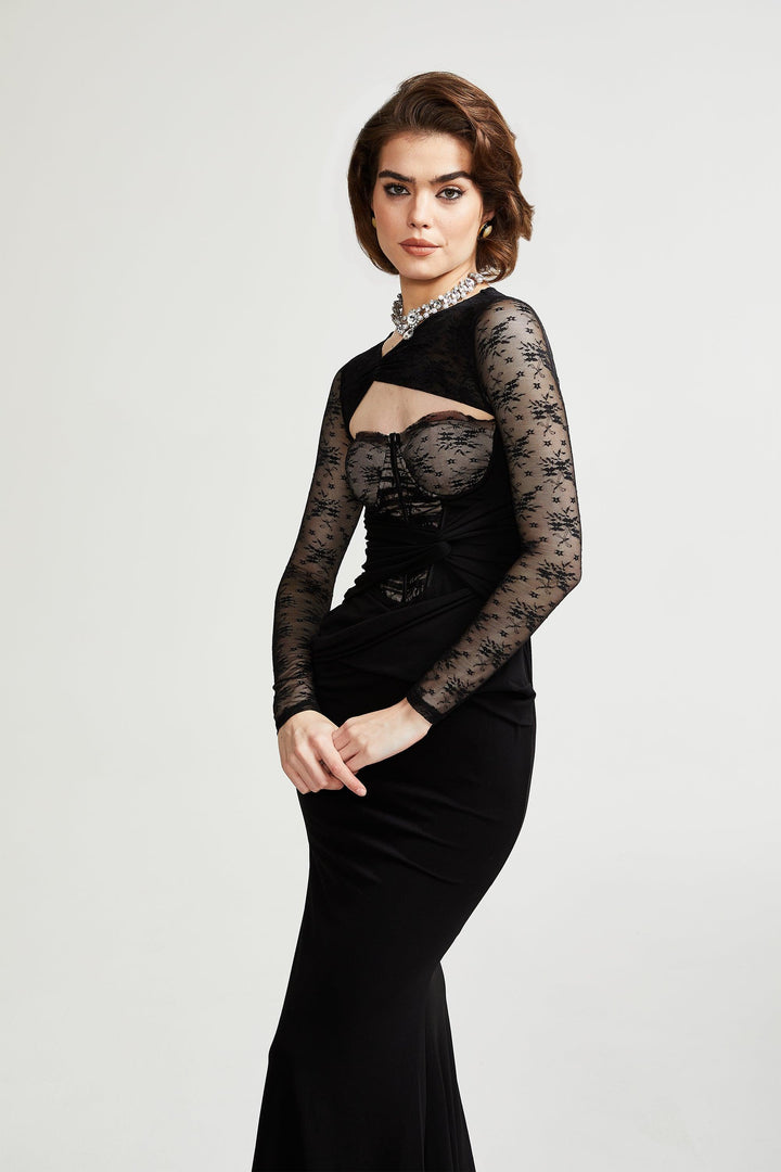 Serena elbise, zarif dantel detayları ve cesur kesimiyle göz alıcı bir şıklık sunuyor. Vücudu saran yapısıyla feminen hatları ön plana çıkarırken, modern tasarımıyla davetlerde stilinizi konuşturun.