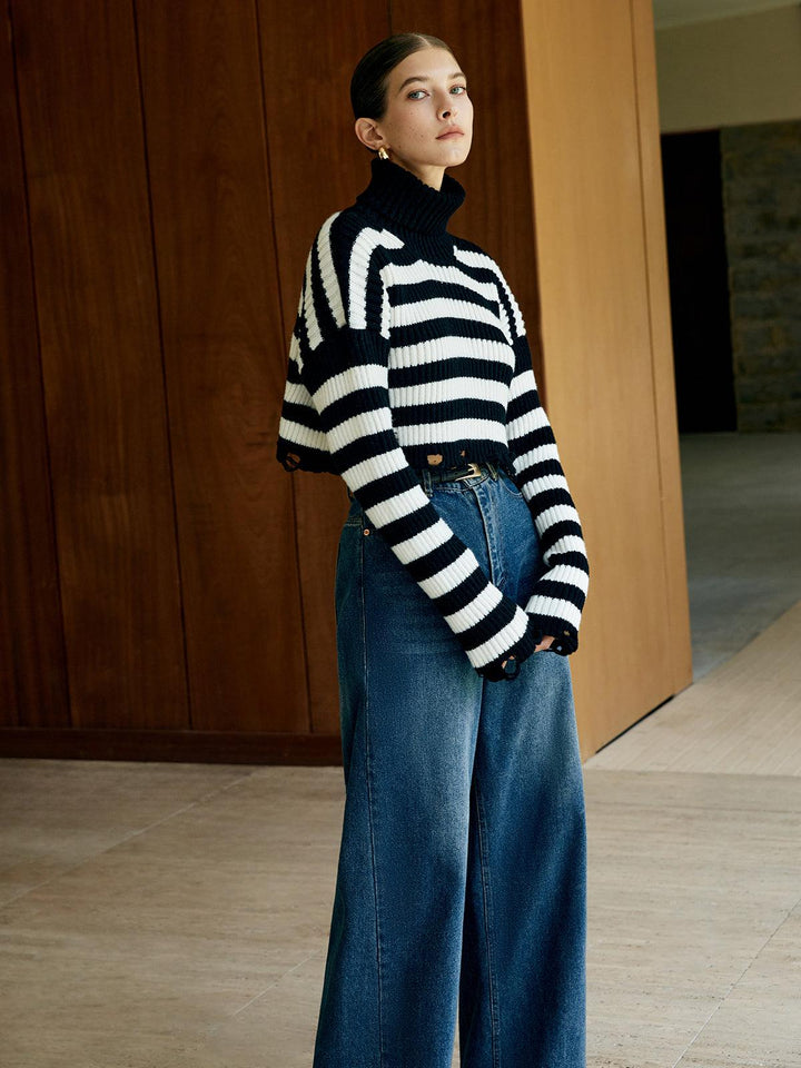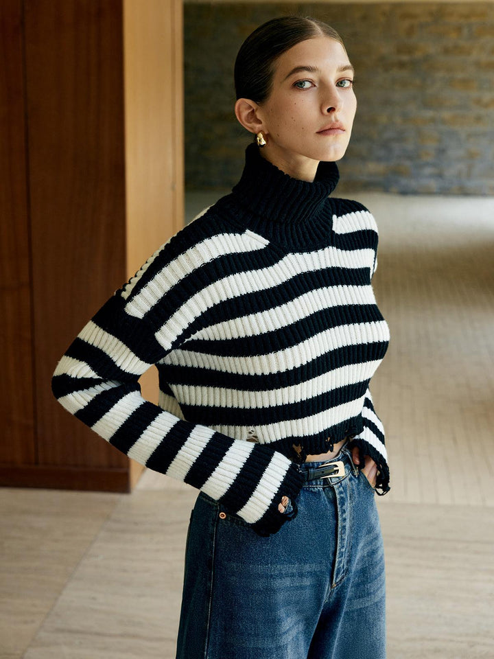 Zamansız çizgiler ve modern bir duruş! Siyah beyaz renklerin mükemmel uyumuyla tasarlanmış bu boğazlı triko kazak, soğuk günlerde tarzınıza sıcaklık katacak. Şıklık ve rahatlık bir arada