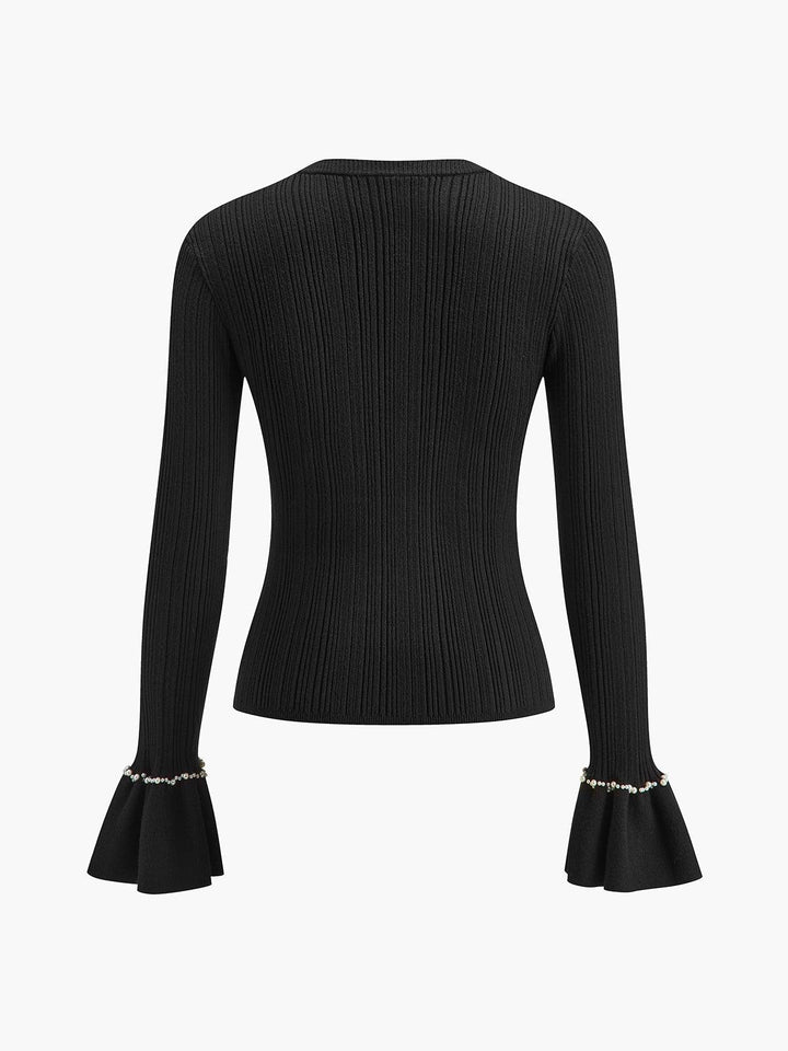 Siyah İnci Detaylı Fırfır Kol Triko Bluz Kazak