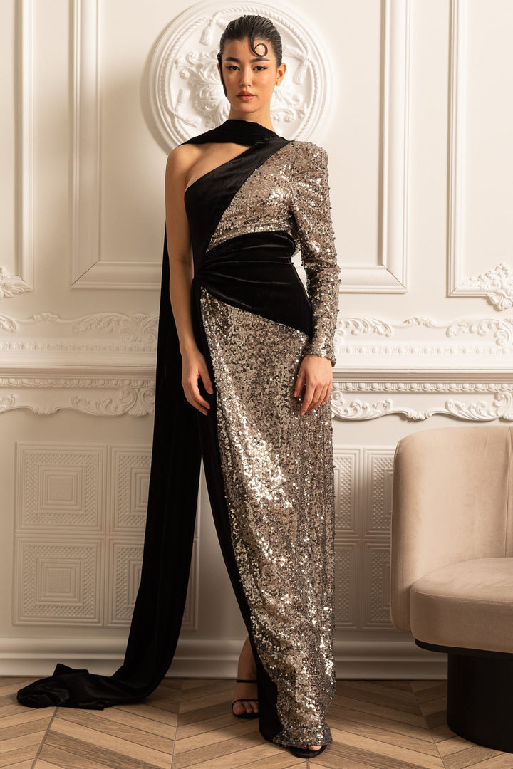 Siyah Kadife Vurguları Olan Göz Alıcı Pullu Elbise