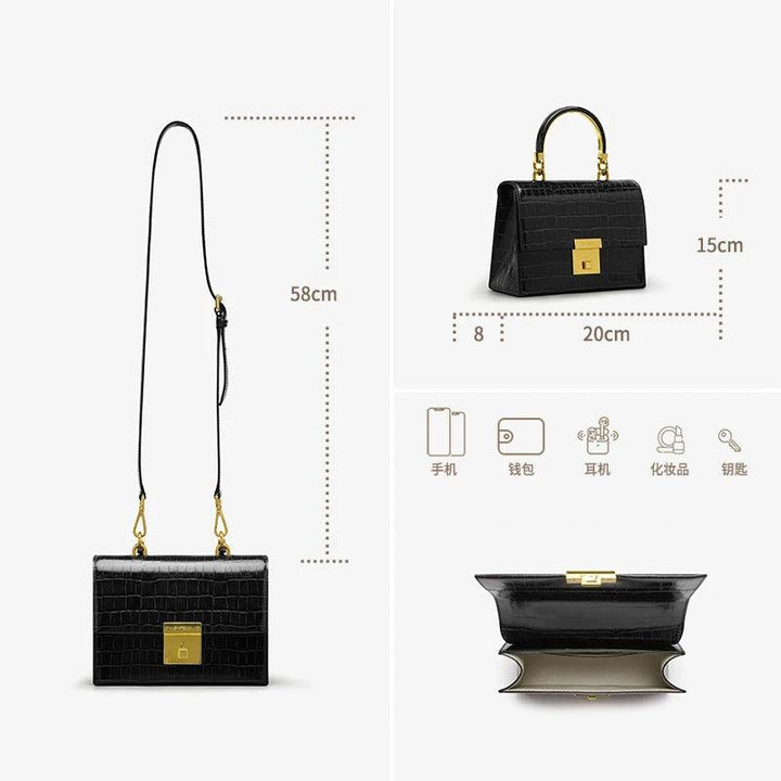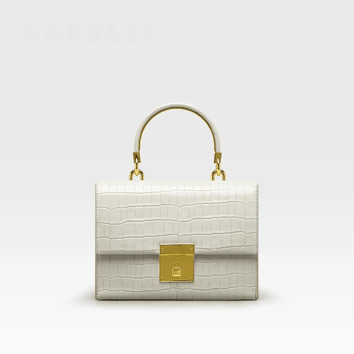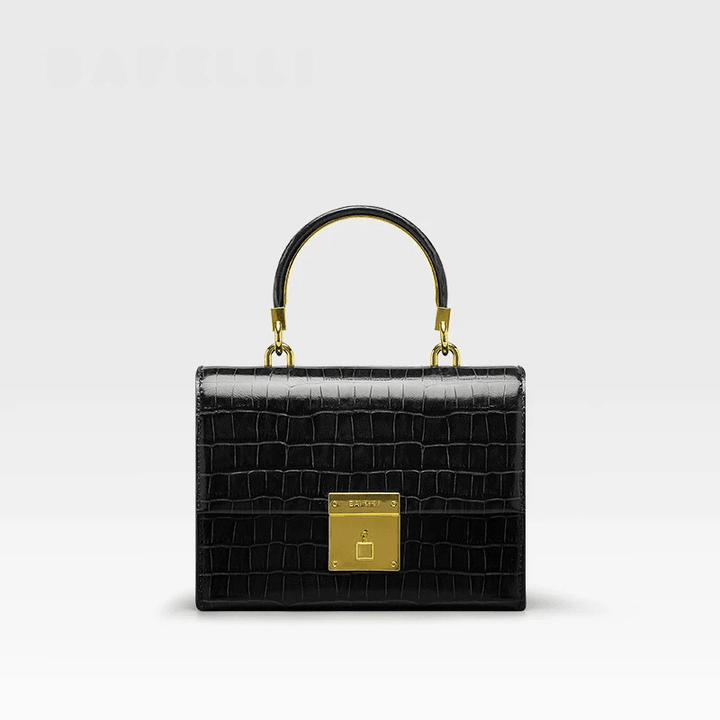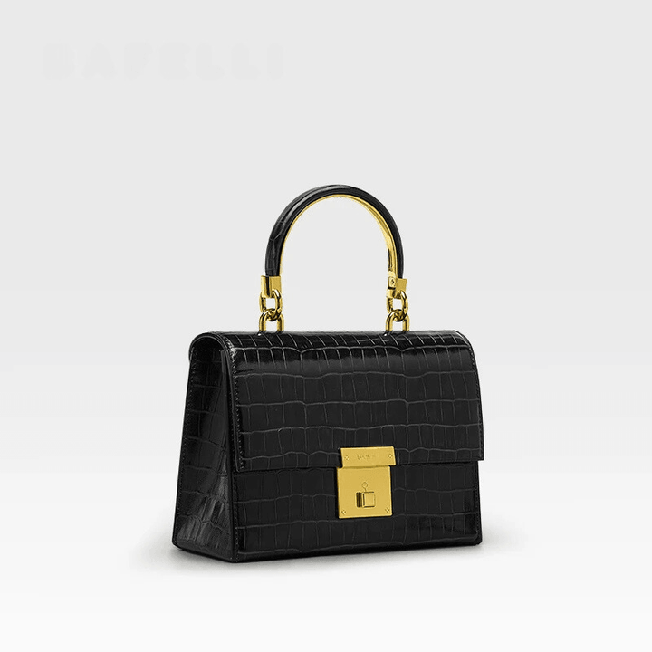 Güvenli toka kilidi ve sap aksanları dahil olmak üzere lüks altın donanım.