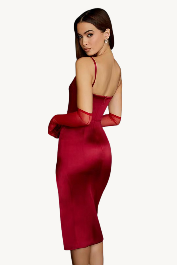 Göz alıcı kırmızı rengi ve omuzdan sarkıtmalı tasarımıyla dikkat çeken bu kokteyl elbisesi, korsaj tarzı baloncu üstüyle mükemmel bir destek ve kaldırma sağlar. Üst koldan zarifçe sarkan kollar ve kalçada toplanan diz boyu eteğiyle vücut hatlarınızı ön plana çıkarır. Diz boyu yırtmaç hareket kolaylığı sağlarken, şıklığınıza şıklık katar. Kokteyl partileri, resmi davetler ve özel siyah kravat etkinlikleri için ideal, unutulmaz bir seçim.