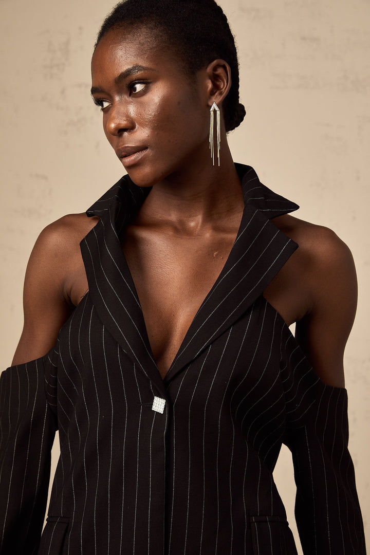 Stefania Siyah Çizgili Arkası Açık Blazer