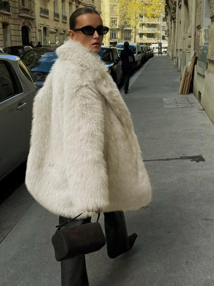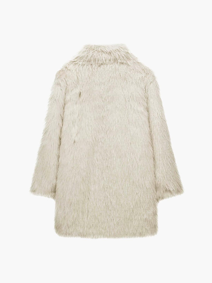 Lüks ve modern bir görünüm sunan krem rengi uzun faux kürk palto, yumuşak dokusuyla soğuk havalarda sıcaklık ve şıklığı bir araya getiriyor. Hem günlük hem de özel kombinlerde tarzınızı ön plana çıkarın!