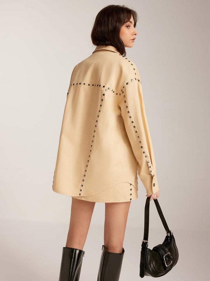 Studded Elegance Ceket ve Etek Takımı, şıklığın ve özgün detayların birleştiği, modern kadın stilini yansıtan eşsiz bir tasarımdır. Metalik zımba detaylarıyla hareket kazanan bu takım, cesur ve zarif bir görünüm sunar. Günlük kullanımdan özel davetlere kadar, her ortamda dikkat çekmek isteyenler için ideal bir seçimdir.
