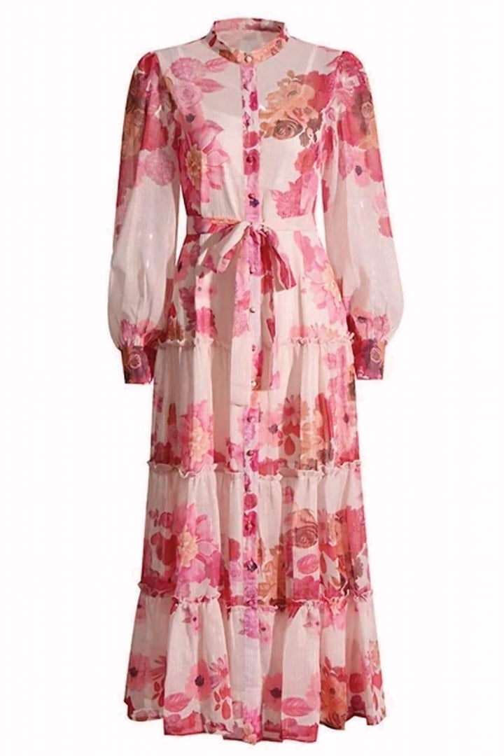 Uzun kollu, büyüleyici çiçek desenli ve romantik fırfırlı uzun elbisemizle zamansız zarafeti keşfedin. Dik yaka sofistike bir dokunuş katarken, hafif şifon kumaş zarif bir silüet için güzelce akıyor. Normal kesimi ve düğmeli açıklığıyla bu elbise, klasik tarzı ve zarif konforu yansıtıyor.