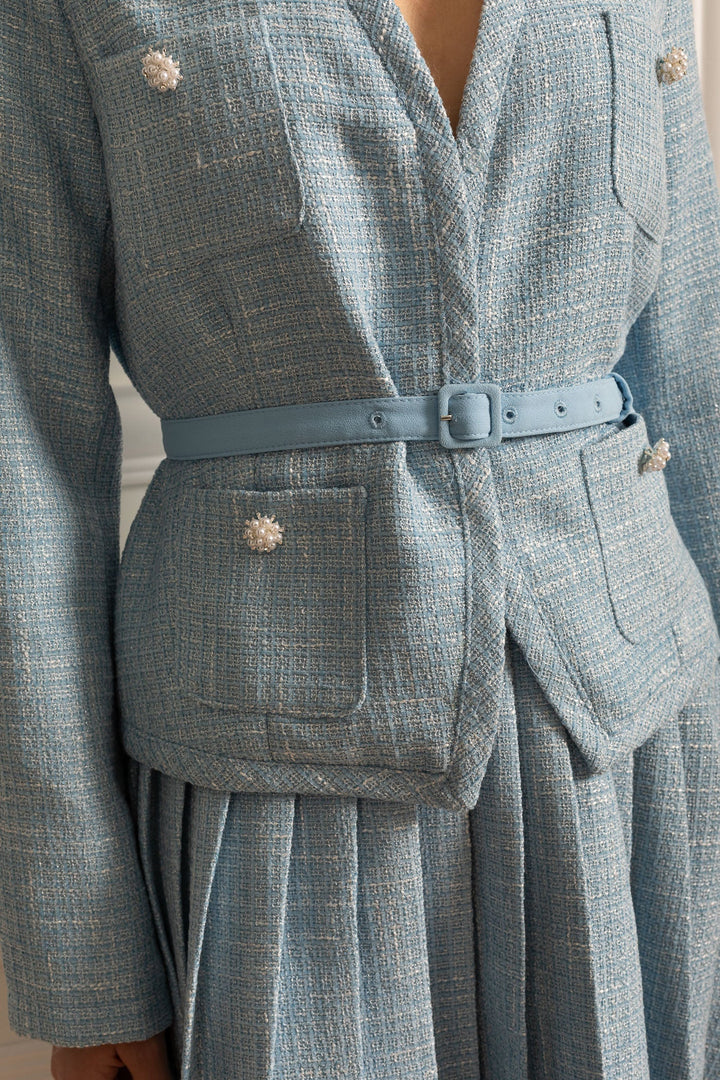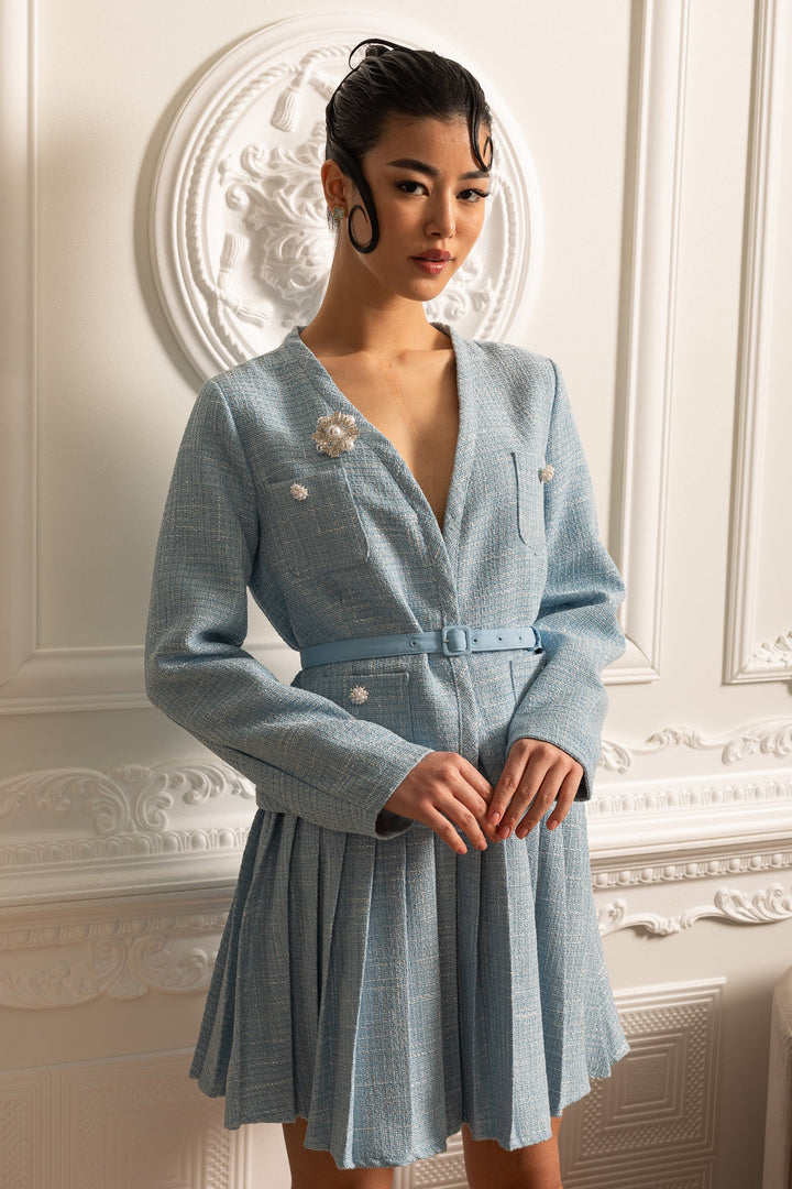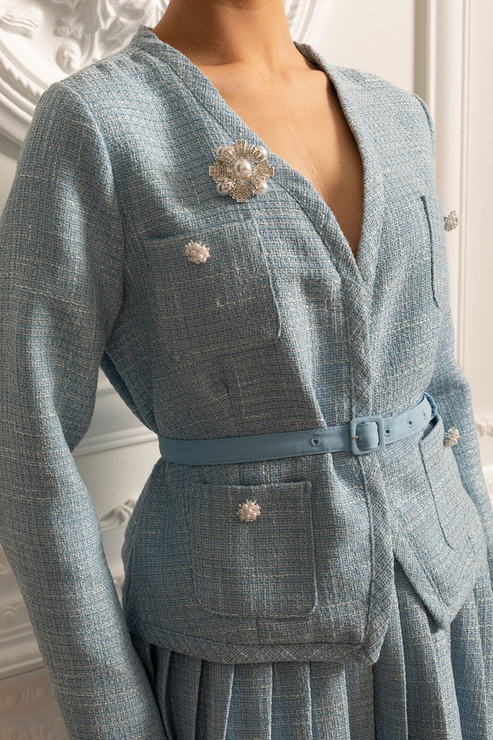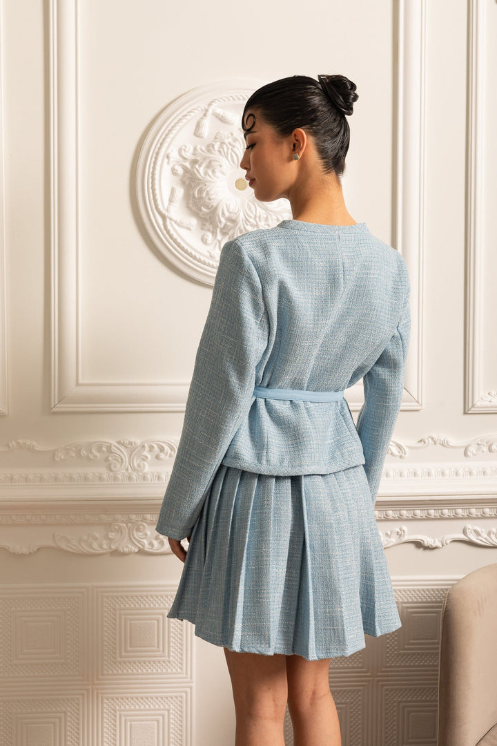Uzun Kollu Üst ve Eşleşen Pileli Mini Etekli Dokulu Ortak Takım - Mavi