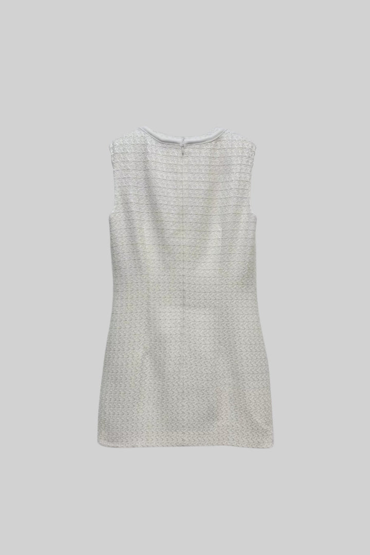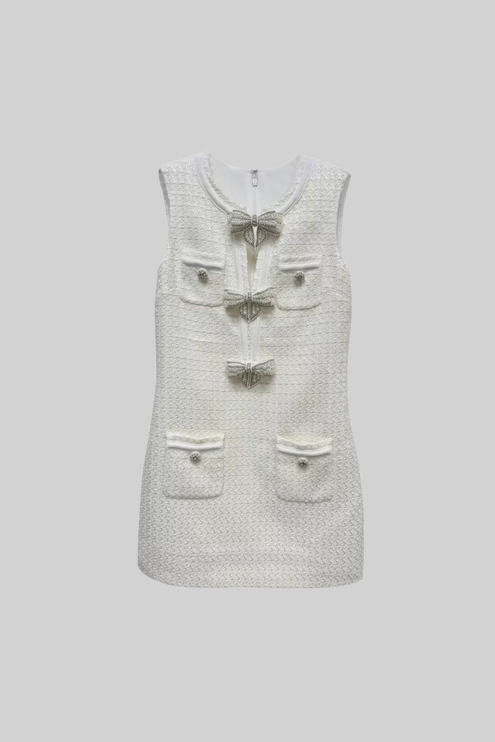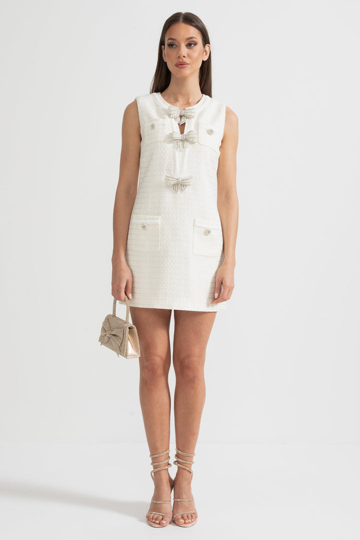 Metal Süslemeli Fiyonklu Beyaz Dokulu Kolsuz Elbise