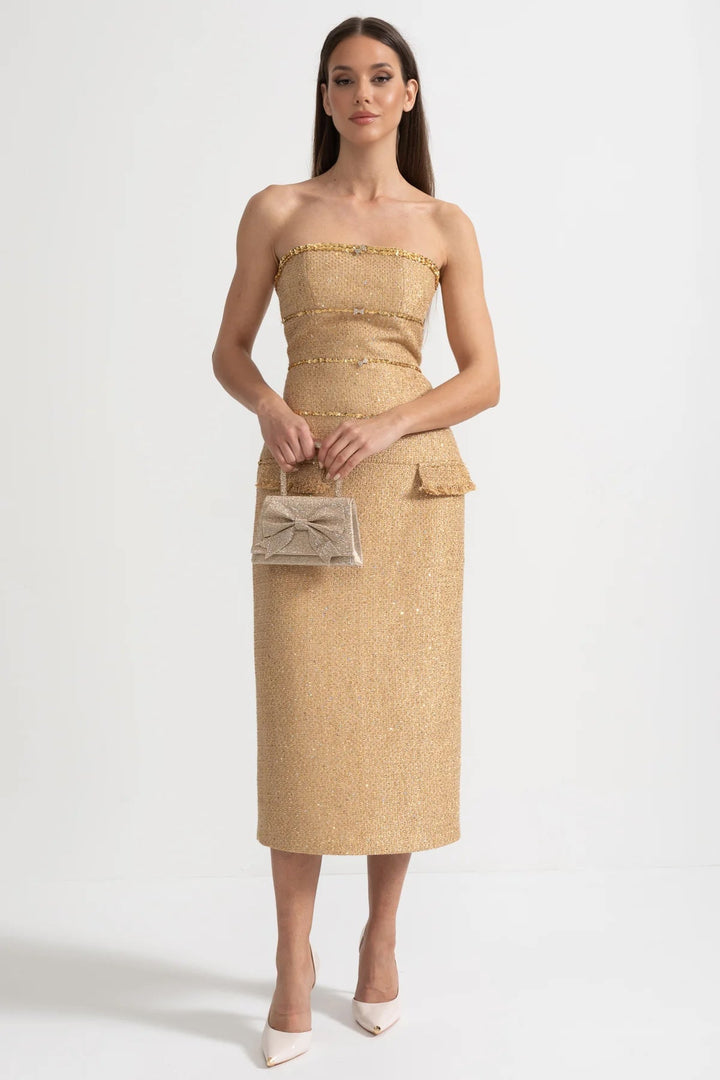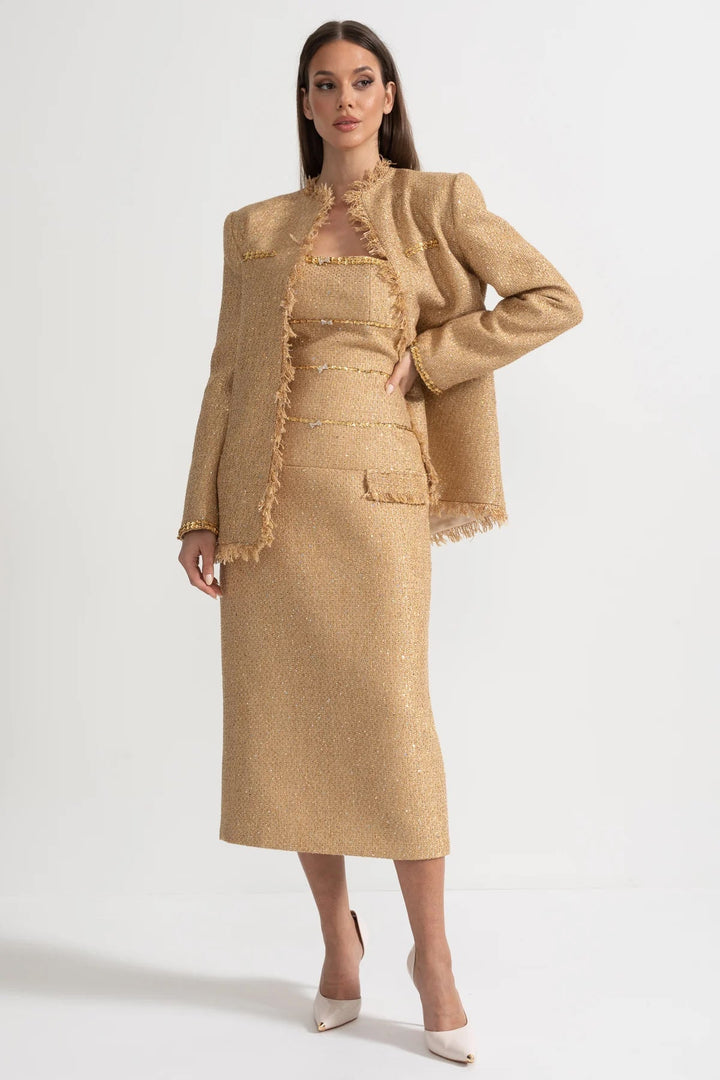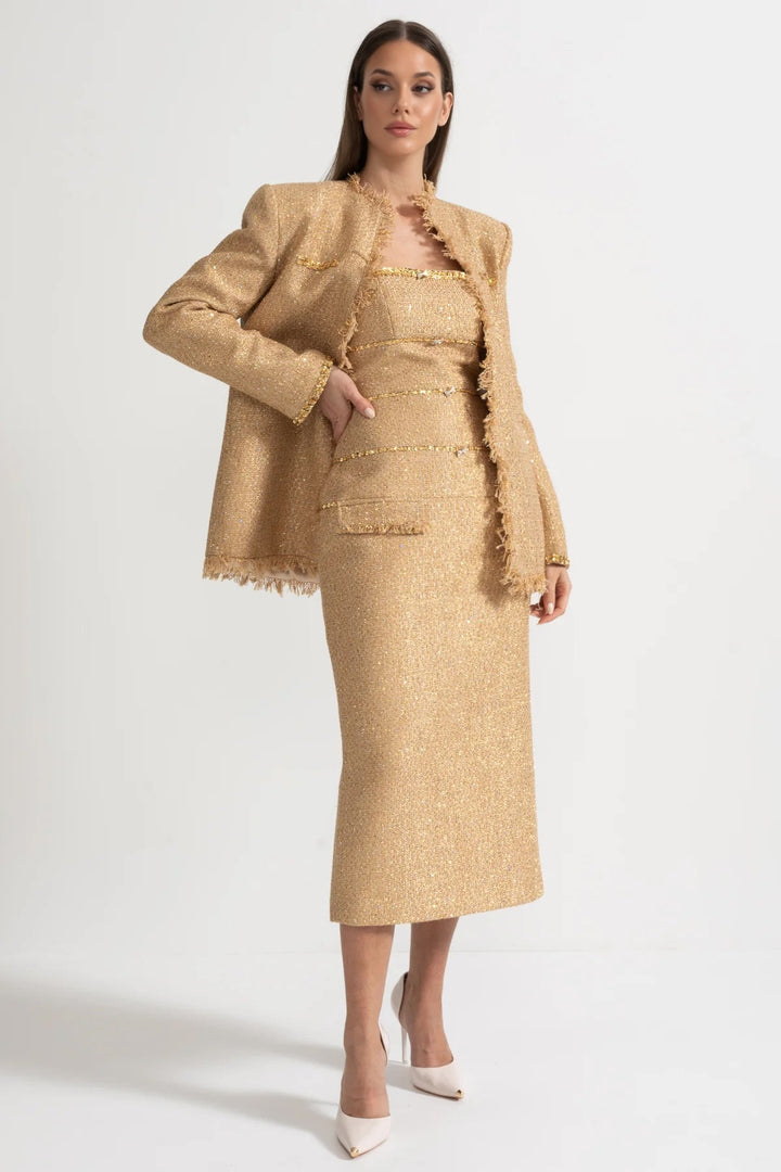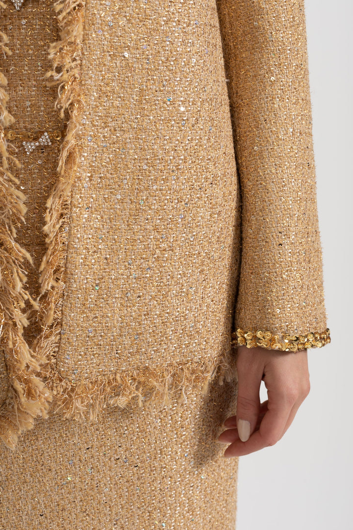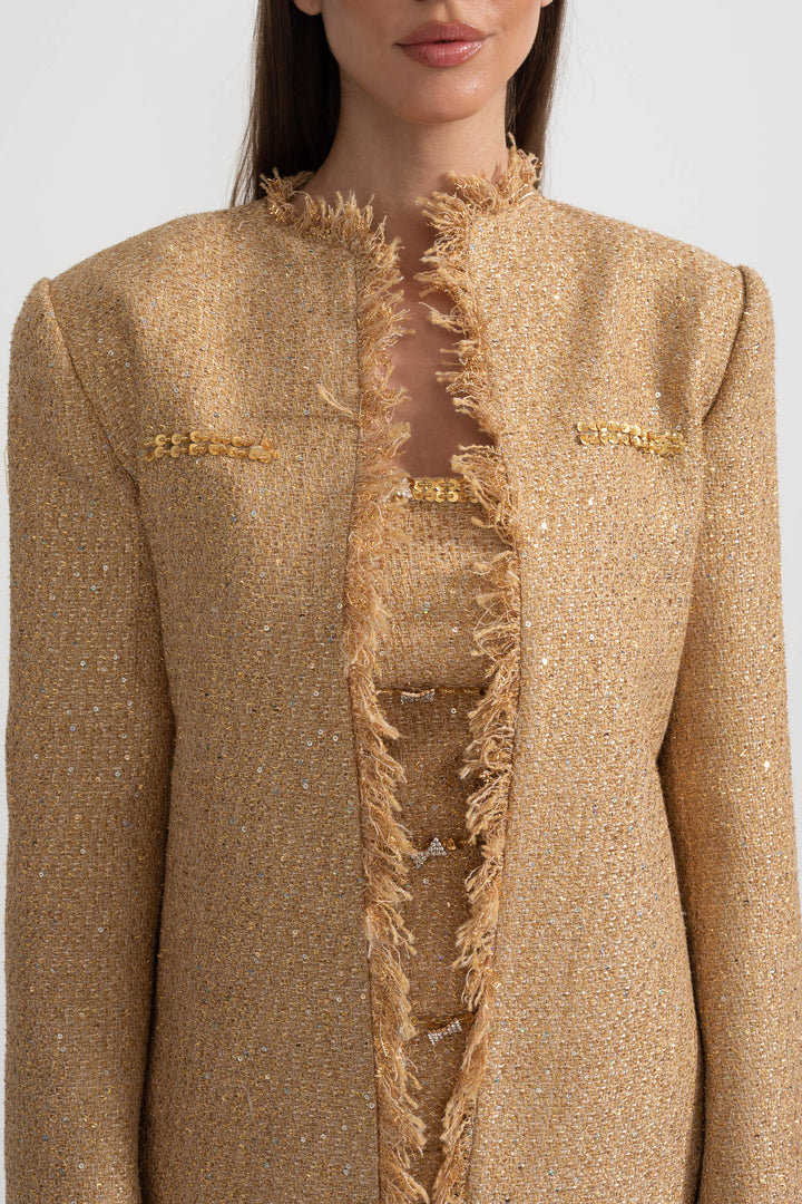 Karmaşık Payet Süslemeli ve Saçak Süslemeli Altın Dokulu Tüvit Palto