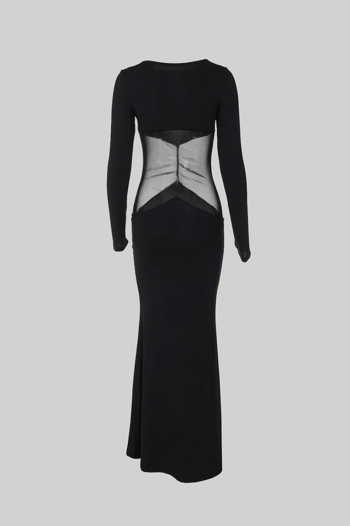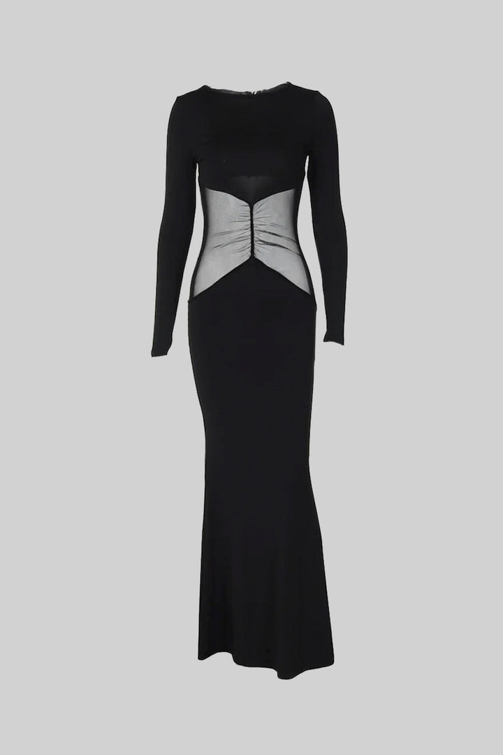 Siyah Zarif Uzun Elbise – Transparan Bel Detaylı