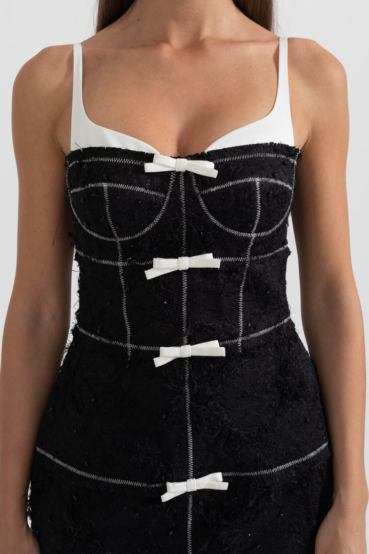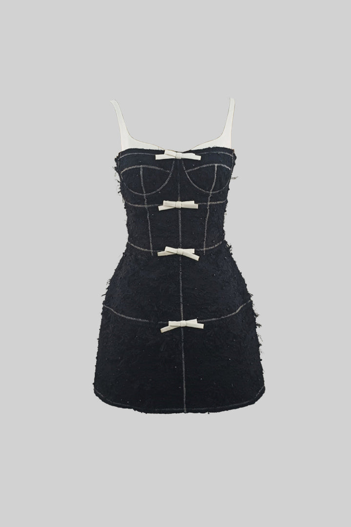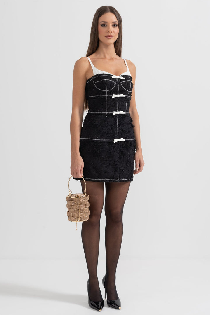 Siyah Mini Elbise – Tüy Desenli Dokulu Kumaş