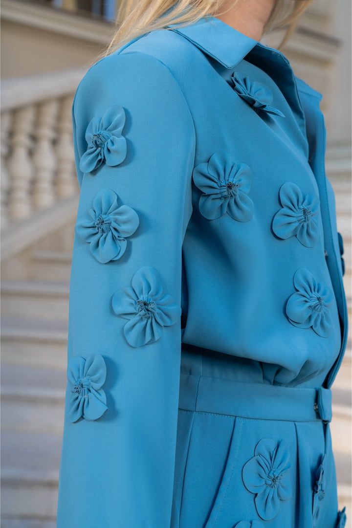 Zarif ve feminen tasarımıyla dikkat çeken Mavi Uzun Kollu Çiçek Detaylı Tulum, 3D çiçek süslemeleriyle şıklığınızı tamamlıyor. Rahat kumaşı sayesinde konforlu bir kullanım sunarken, uzun kollu tasarımıyla hem günlük hem de özel davetlerde sofistike bir duruş sergiliyor.