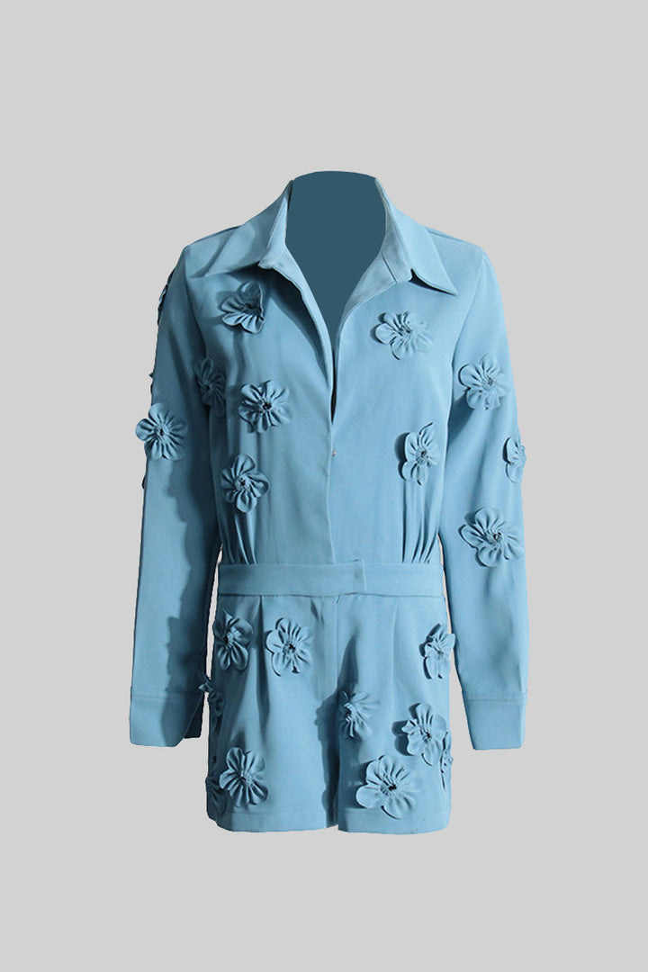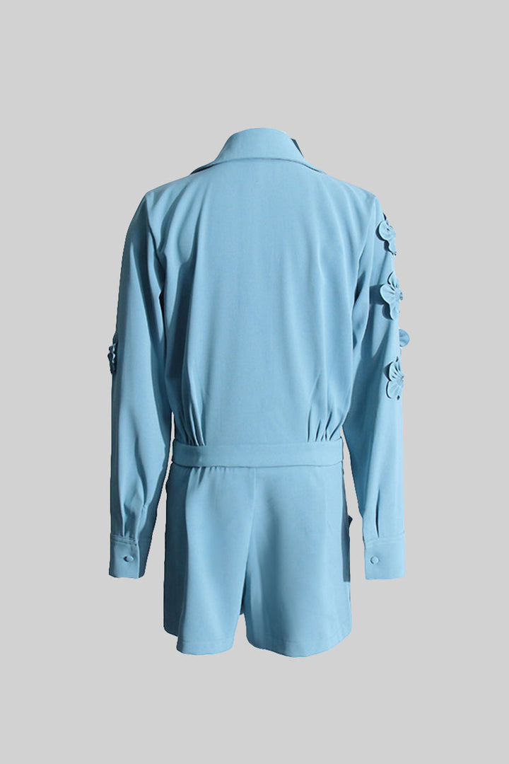 Mavi Uzun Kollu Çiçek Detaylı Tulum