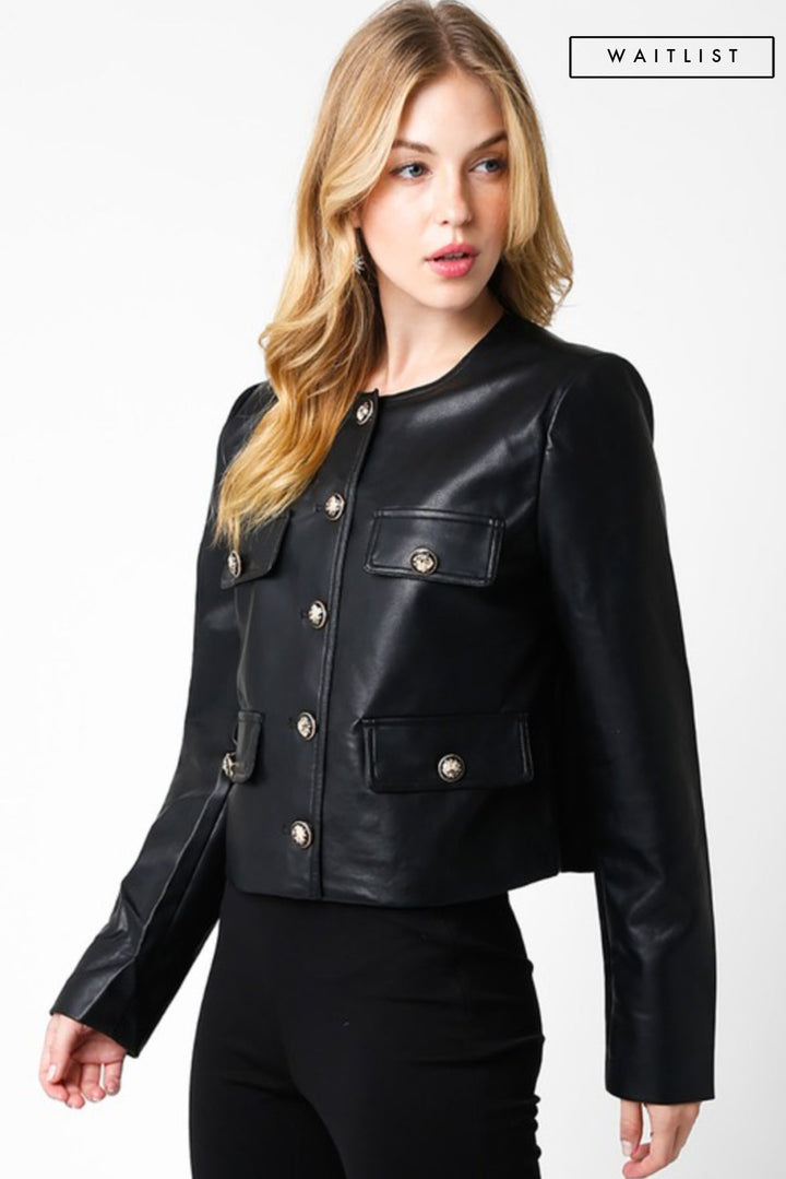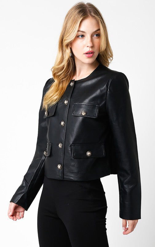 Cesur siyah rengiyle öne çıkan Vegan Deri Kısa Ceket, moda tutkunlarının dolabında mutlaka yer alması gereken parçadır. Yuvarlak yaka detayı, uzun kolları ve altın düğmeli ön kapamasıyla her kombine cool bir dokunuş ekler. İster günlük şıklığını tamamla, ister özel davetlerde tarzını ön plana çıkar.